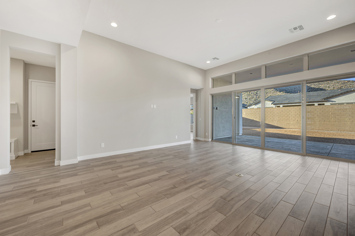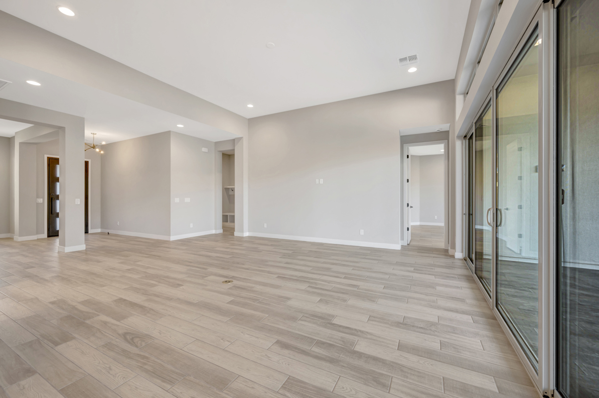 Soaring 12-foot ceilings in the family room complement a 16-foot sliding glass door that opens to the private backyard, creating a seamless connection to outdoor living.