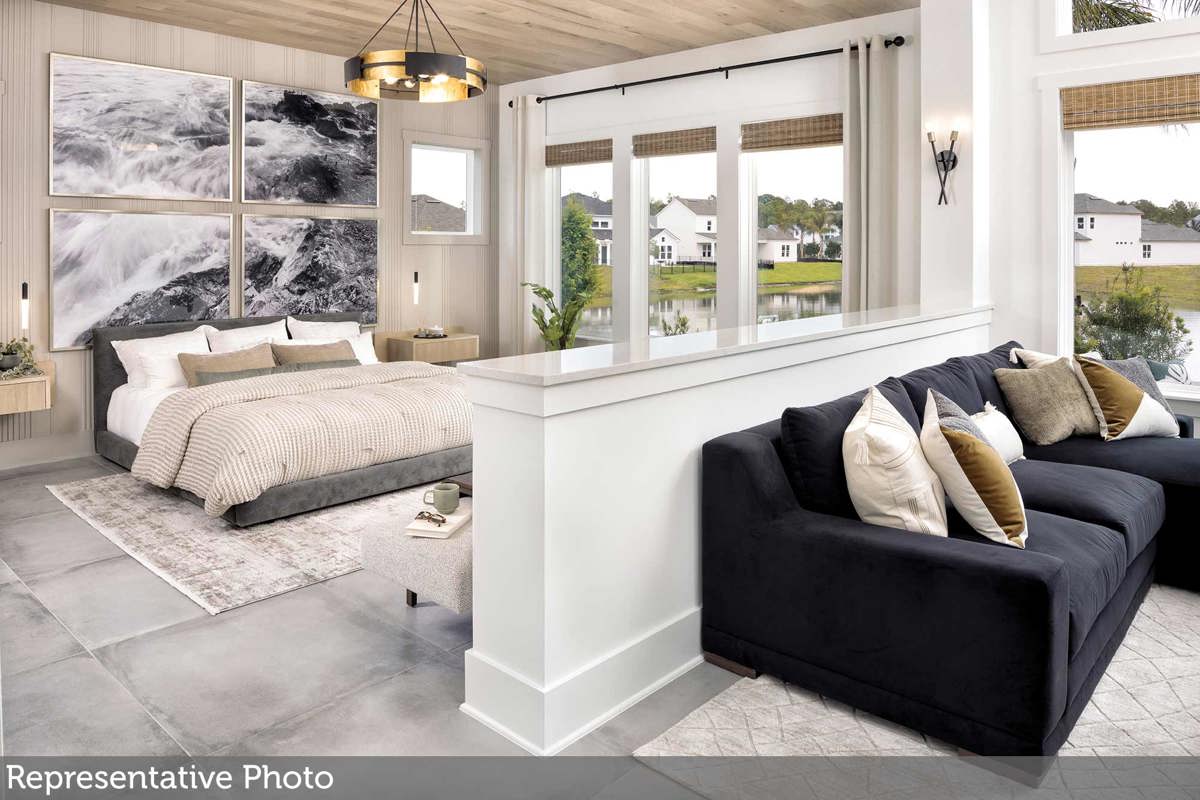 Final opportunities remain in Coral Ridge at Seabrook, Nocatee’s premier gated community. Ready in late 2025, the Dawn plan showcases refined single-story living on an impressive 80-foot homesite. An inviting courtyard with a fountain feature sets an elegant tone before you step inside to an expansive open plan that unites the family, dining, and kitchen areas beneath soaring ceilings.