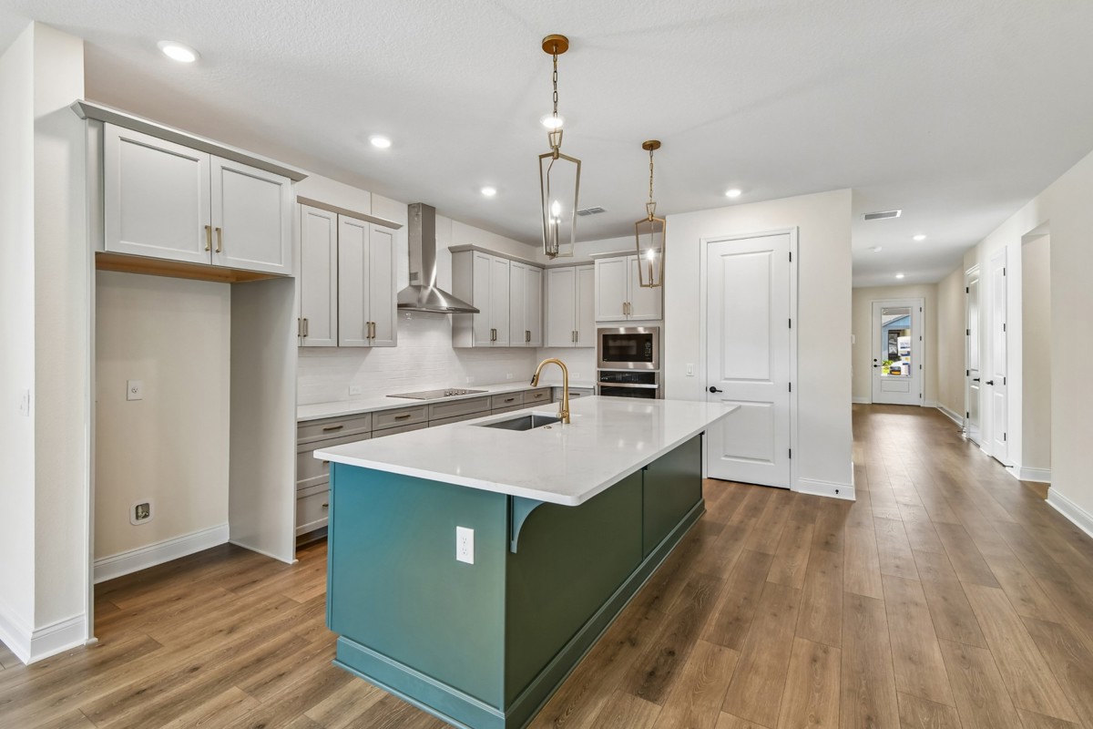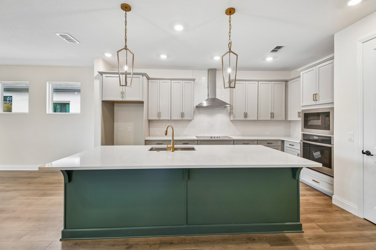 The open kitchen features a cooktop with built in oven and microwave for streamlined meal preparation. Painted oat perimeter cabinets, a sage green island, and gold hardware and fixtures create a designer-inspired focal point.