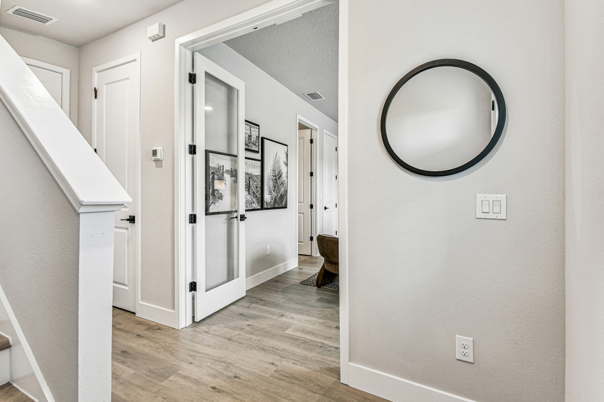 Step inside to a bright first-floor study enclosed with French doors, offering the perfect flexible space for a home office or creative retreat. The oversized rear-entry garage accommodates two cars with extra room for a golf cart or under-stair storage—rare for a townhome.