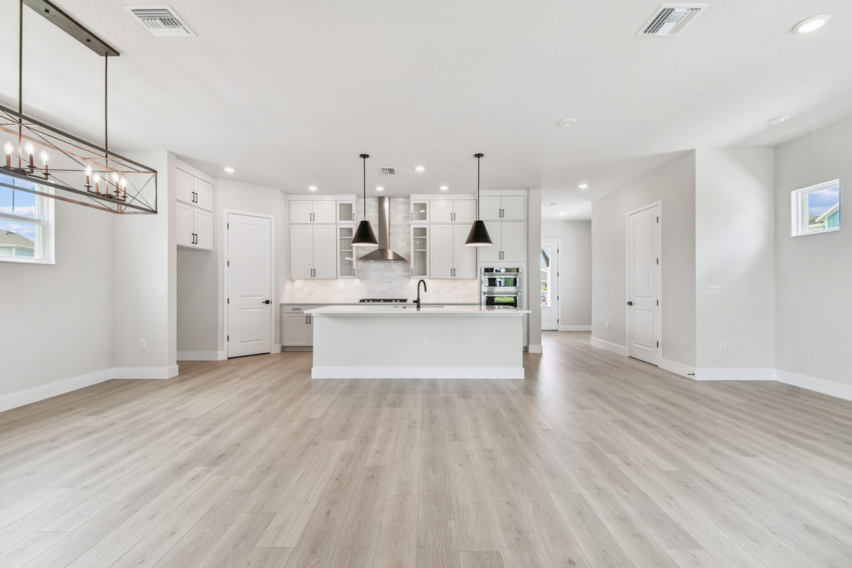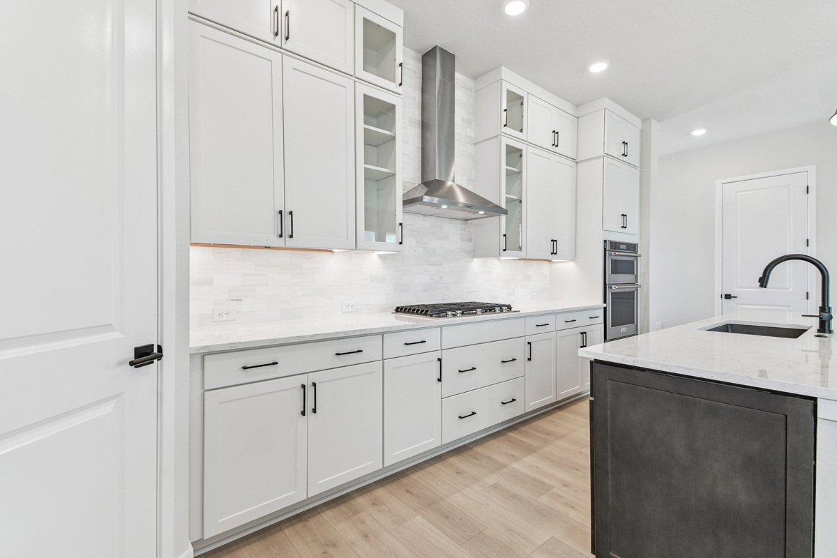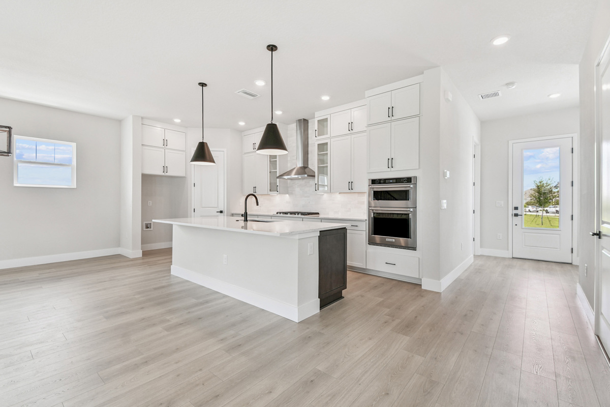 The spacious open-concept layout features 10-foot ceilings on the main floor, flooding the home with natural light and enhancing the airy feel. At the heart of the home is a beautifully appointed designer kitchen featuring a built-in oven and microwave, a gas cooktop with a sleek vent hood, and double-stacked cabinetry that reaches all the way to the ceiling. The oversized island overlooks the dining and family rooms, creating the perfect space for entertaining or everyday living. A convenient storage area tucked under the staircase keeps everything organized and out of sight.