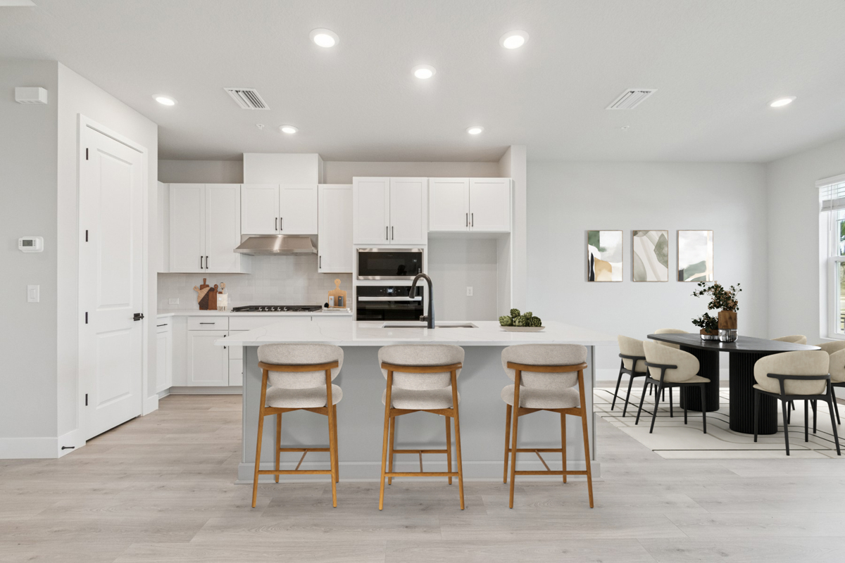 The open main level is ideal for everyday living and entertaining, featuring a spacious family room, dining area and a designer kitchen. Highlights include quartz countertops, 42-inch upper cabinets, a stainless vent hood, gas cooktop, built in microwave, built in oven and a large center island.
