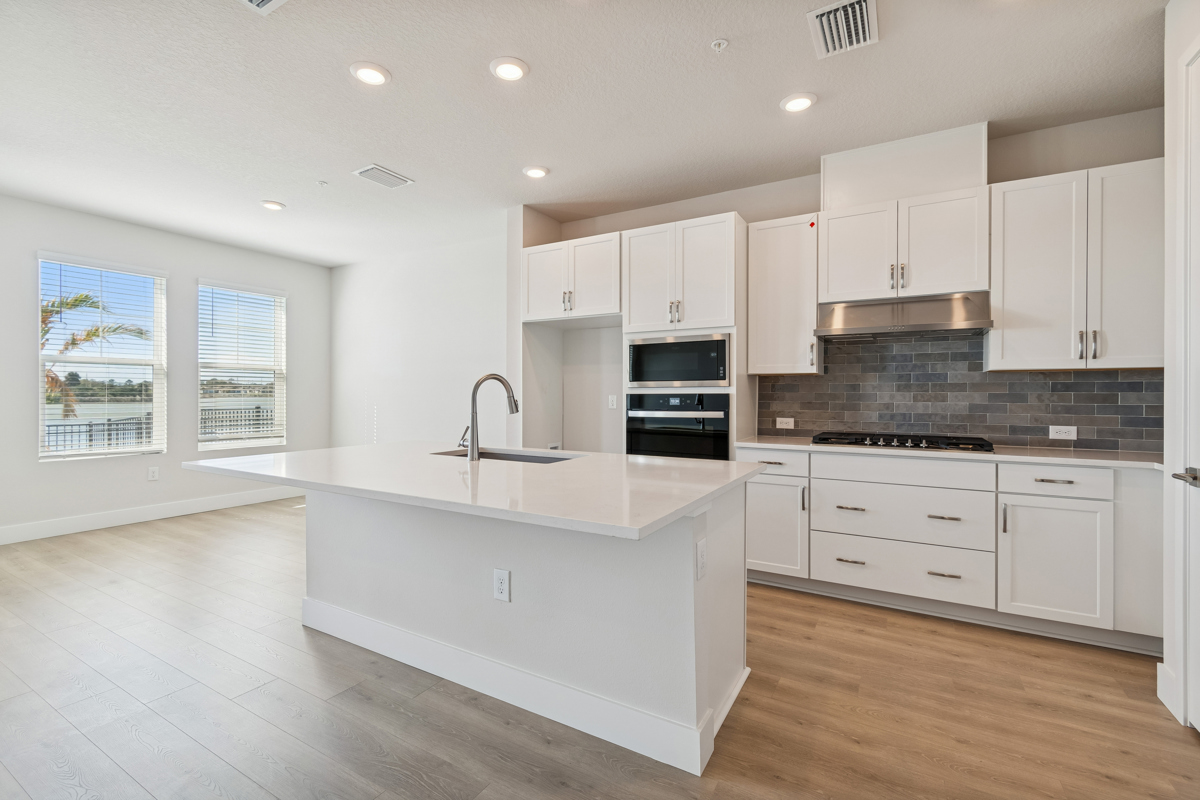The open-concept main level is ideal for everyday living and entertaining, showcasing a spacious family room, dining area, and a designer kitchen upgrade featuring quartz countertops, 42” upper cabinets, a stainless steel vent hood, gas cooktop, built-in microwave, and built-in oven, anchored by a large center island. A convenient powder room completes the first floor.