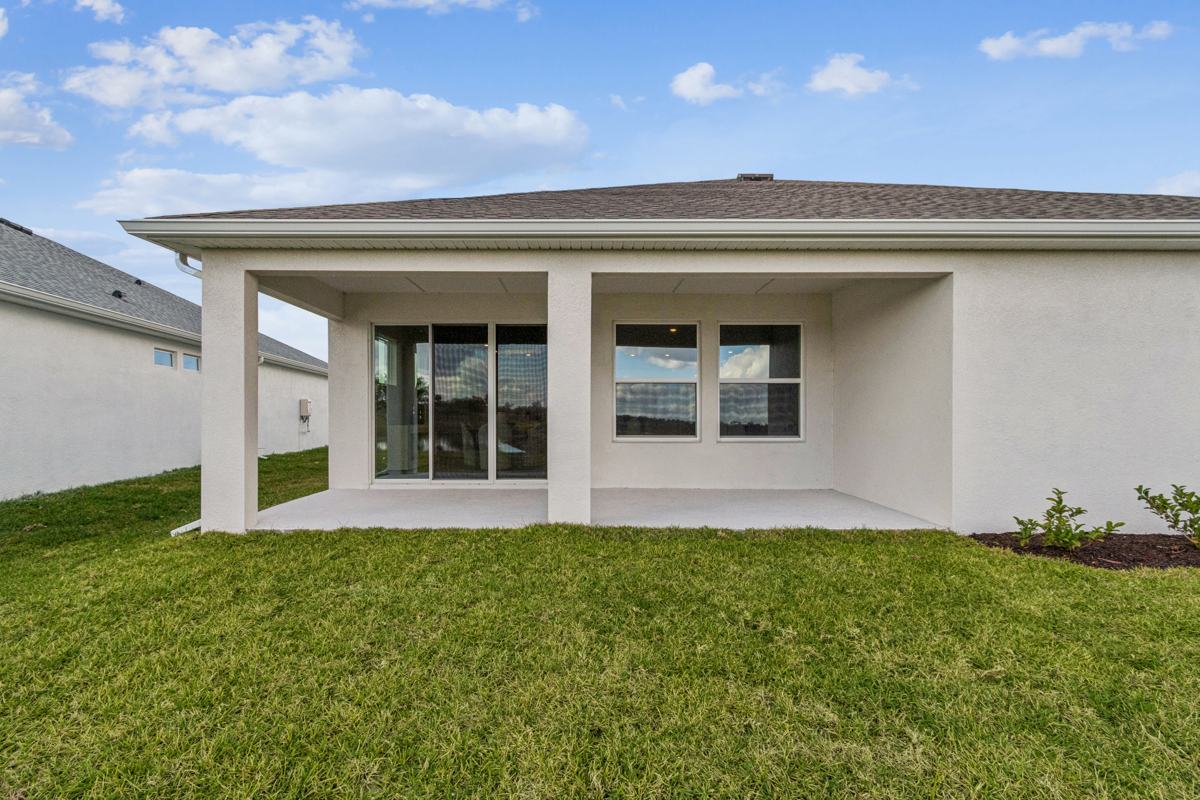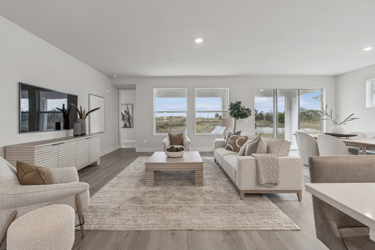 Enjoy elevated design details like soaring 9’4” ceilings, 8-foot doors, elegant laminate flooring, quartz countertops, and sleek satin nickel hardware finishes throughout. The open-concept layout seamlessly connects the main living spaces, while sliding glass doors off the extended lanai bring in natural light and provide beautiful views of the tranquil community pond—right from your backyard.