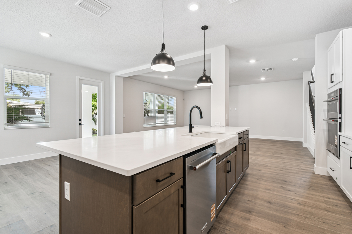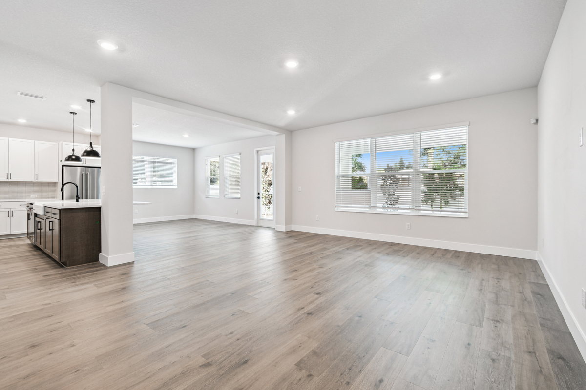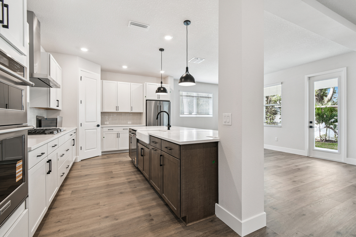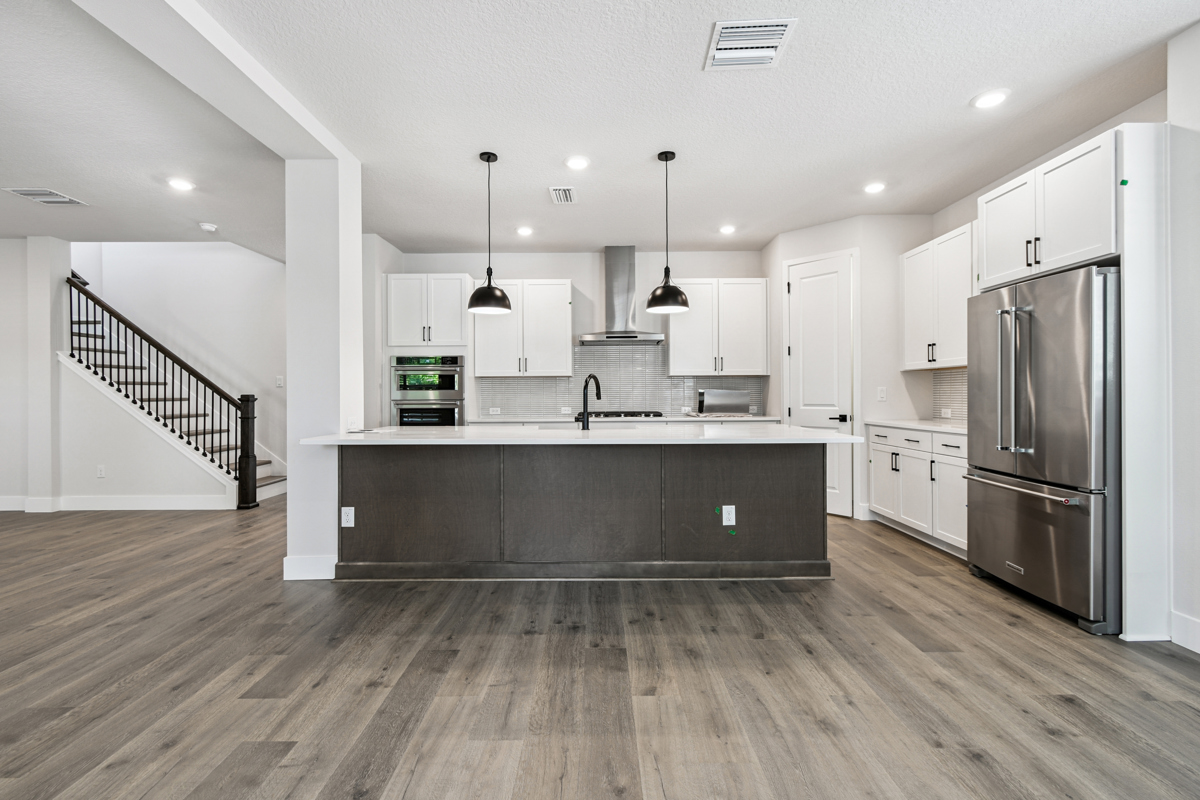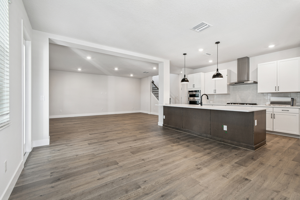 The open-concept main living area is designed for modern living and effortless entertaining. The chef-inspired kitchen showcases crisp white cabinetry, gleaming quartz countertops, a gas cooktop, and an oversized island with seating for five or more—perfect for casual meals and gatherings. The kitchen flows seamlessly into the family and dining rooms, which overlook a full-width covered lanai and fenced backyard with lush landscaping and irrigation, ready for your personalized outdoor oasis.