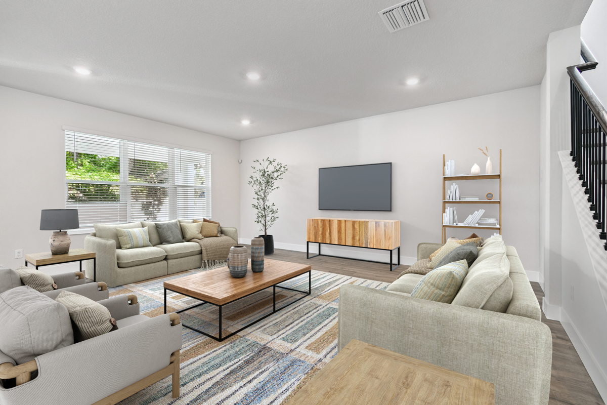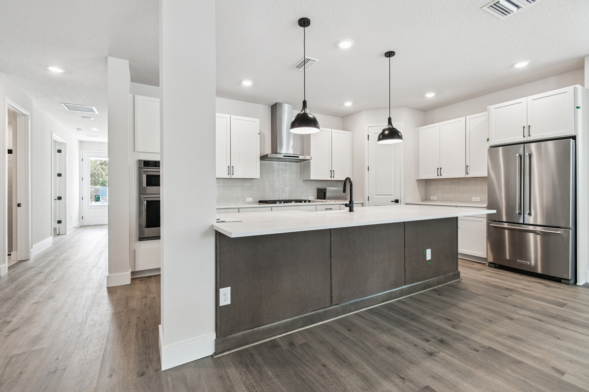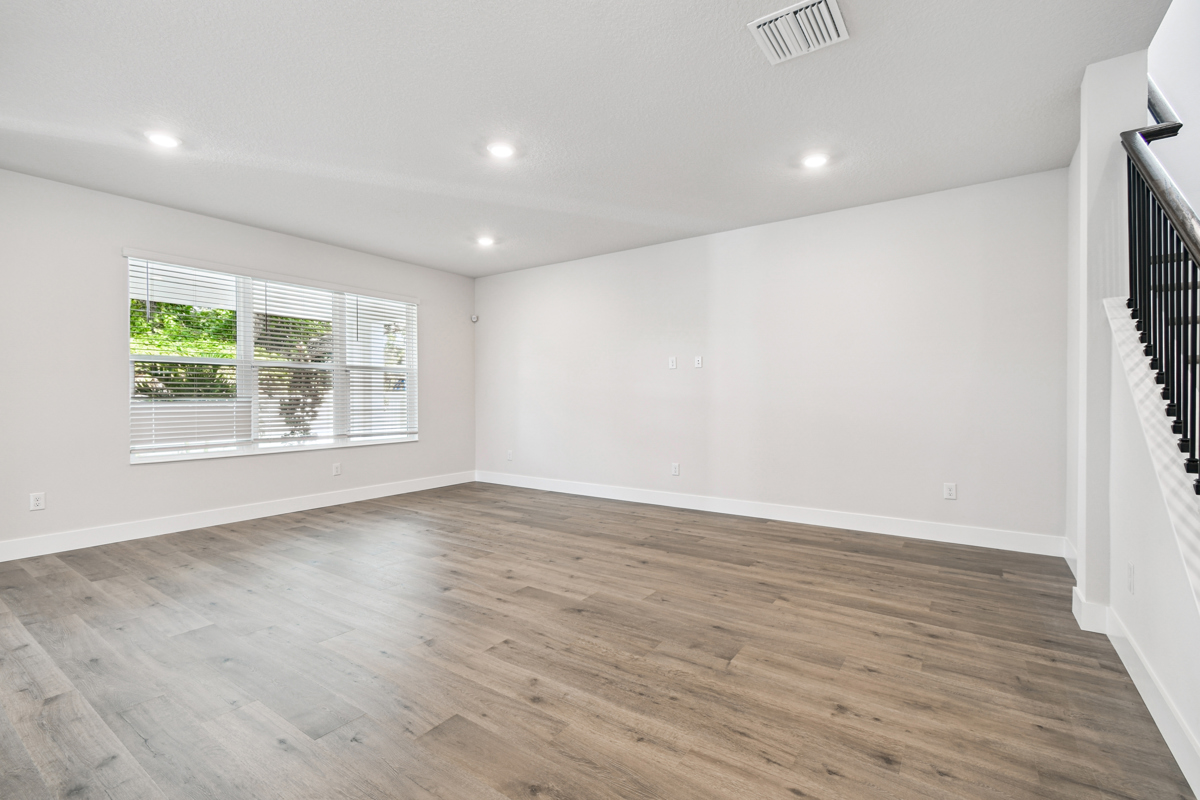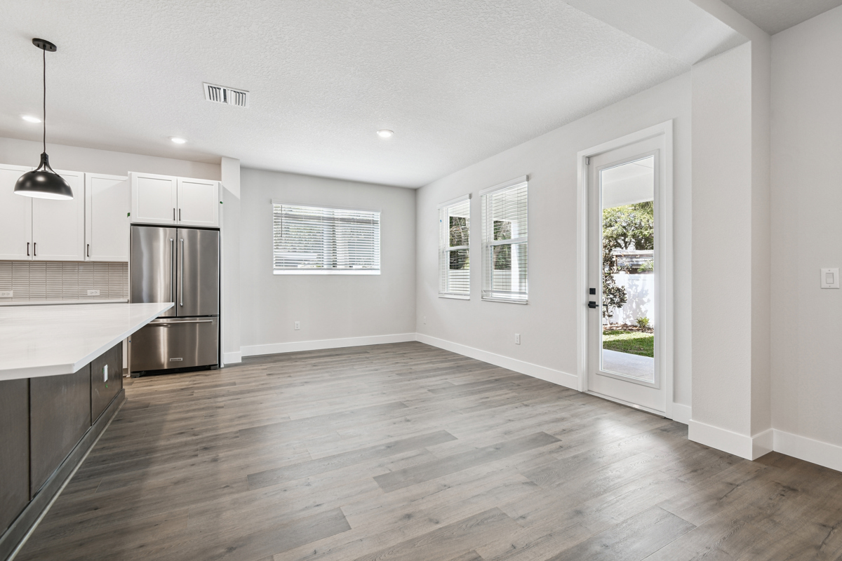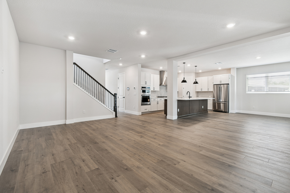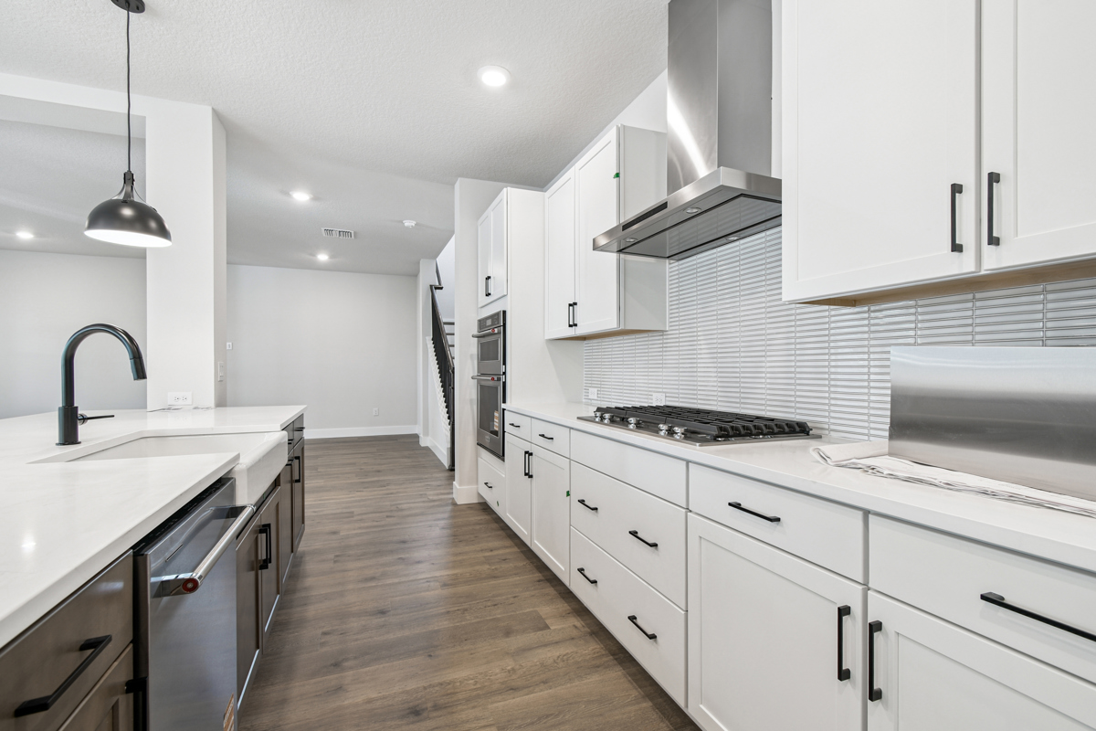 The open-concept main living area is designed for modern living and effortless entertaining. The chef-inspired kitchen showcases crisp white cabinetry, gleaming quartz countertops, a gas cooktop, and an oversized island with seating for five or more—perfect for casual meals and gatherings. The kitchen flows seamlessly into the family and dining rooms, which overlook a full-width covered lanai and fenced backyard with lush landscaping and irrigation, ready for your personalized outdoor oasis.