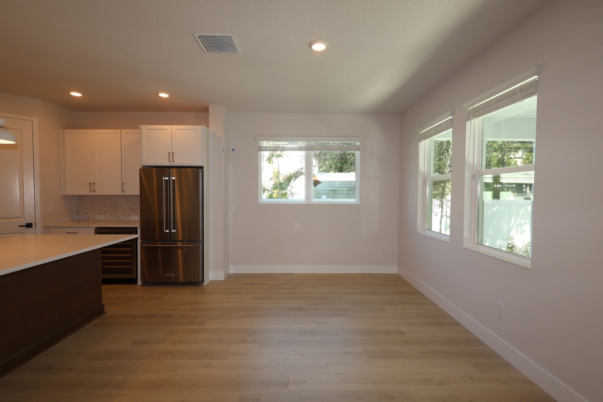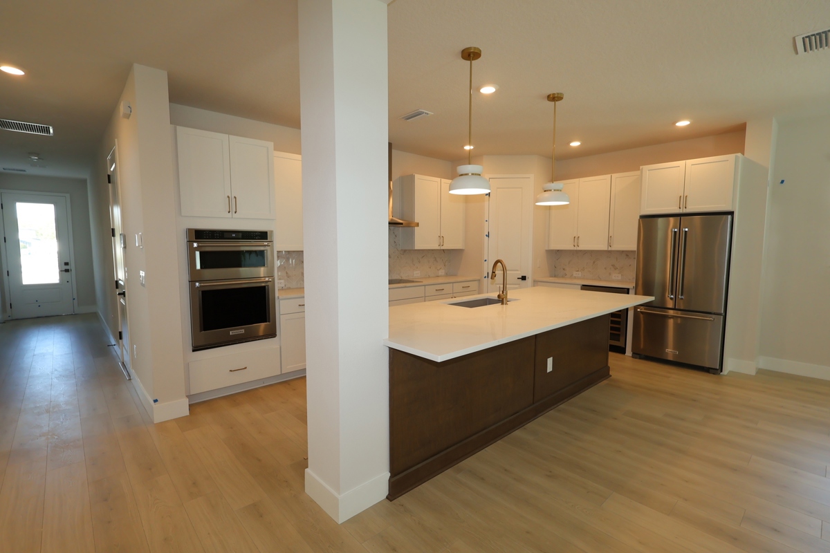 The open-concept main living area is designed for modern living and effortless entertaining. The chef-inspired kitchen features crisp white cabinetry on the perimeter and a warmer island with champagne bronze accessories drawing on the colors of sand and sea. Quartz countertops, an induction cooktop, and an oversized island with seating for five or more—perfect for casual meals or gathering with friends. The kitchen flows seamlessly into the spacious family and dining rooms, all overlooking a full-width covered lanai and fenced backyard with landscaping and irrigation—ready for your personal backyard oasis.
