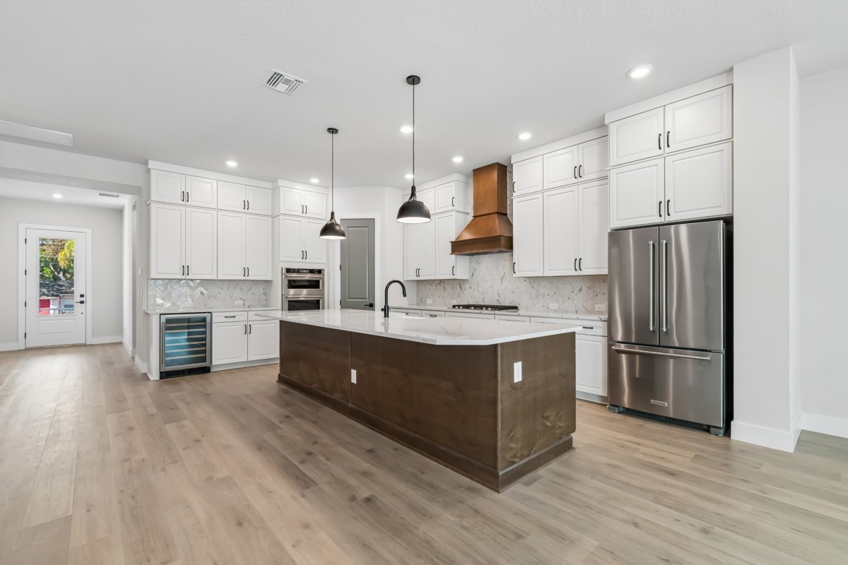 Step inside to an open-concept great room designed for gathering and entertaining. The gourmet kitchen is the true heart of the home, featuring a striking 10-foot island, stacked cabinetry, sleek quartz countertops with matching backsplash, and sliding glass doors that flow to a covered lanai and fenced backyard with its own half bath — ideal for outdoor living.