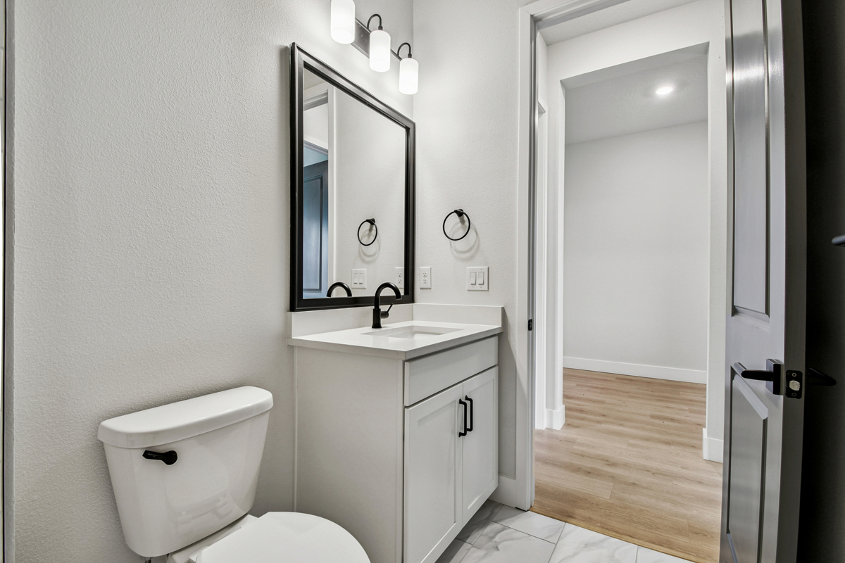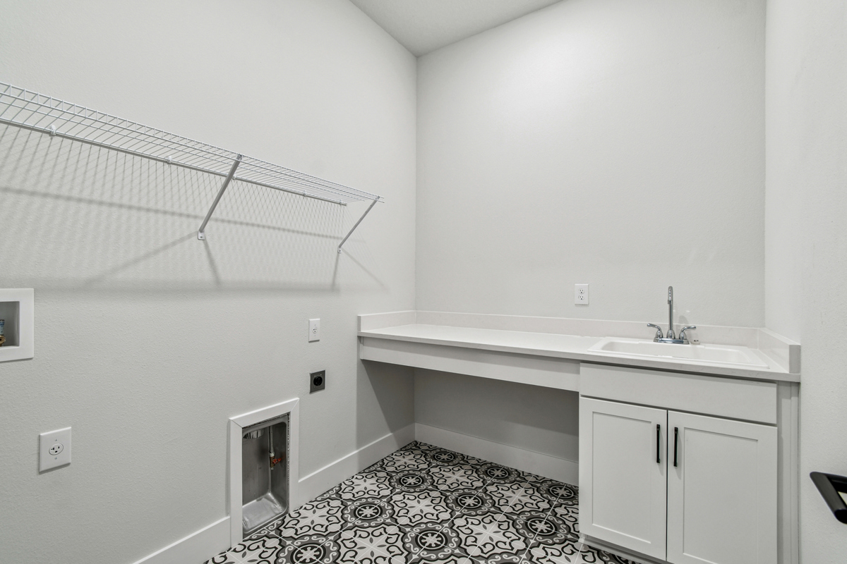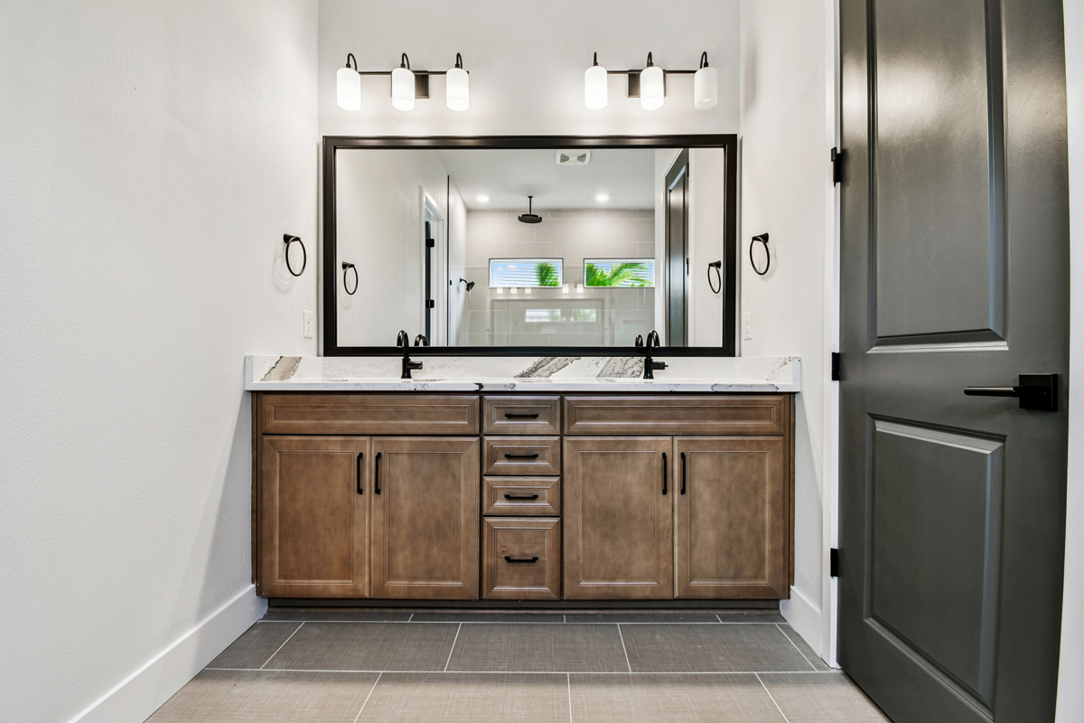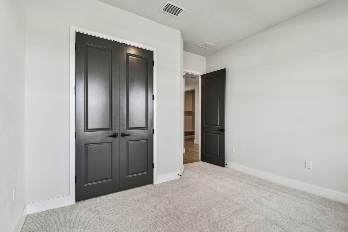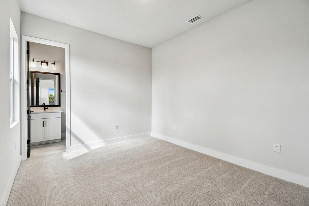 A guest suite with a private bathroom is nestled behind the kitchen, adding multigenerational versatility to this unique floor plan. Two junior bedrooms also rest on either side of a shared bathroom opposite the three-car garage.
