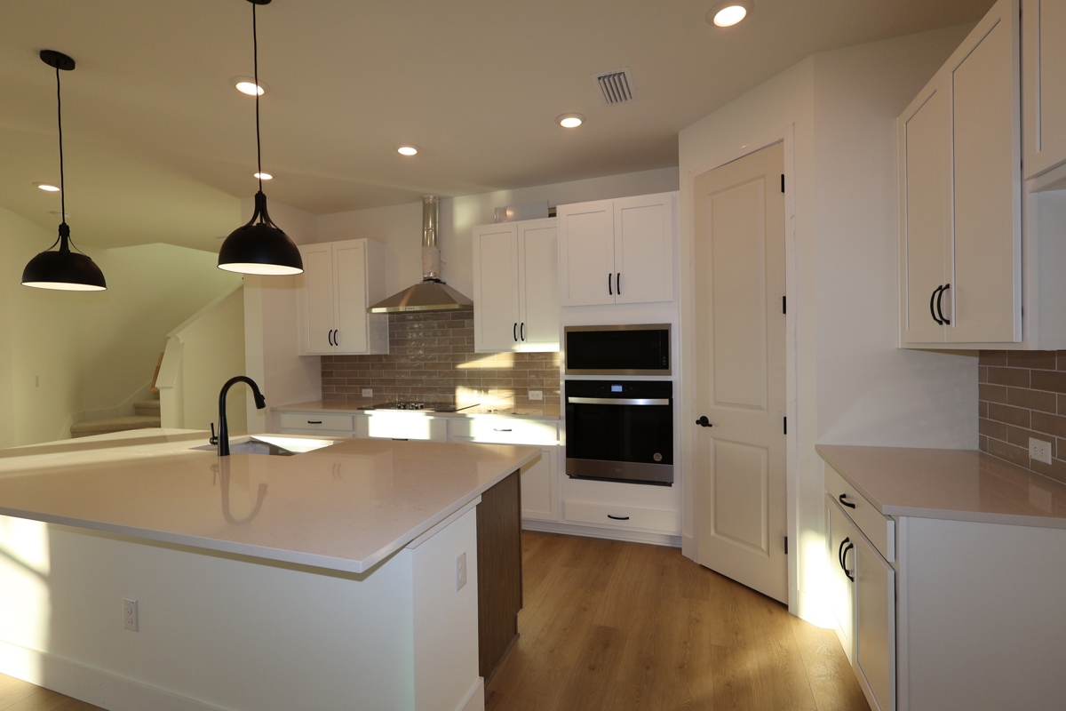The contemporary kitchen is designed with function and style in mind, featuring a corner pantry, center island, and open sight lines. White cabinetry pairs beautifully with a warm wood island topped with quartz countertops, while black hardware and lighting add a bold finishing touch. Inspired by natural rock terrain, the interior design blends earthy finishes and tones to create an airy, welcoming atmosphere.