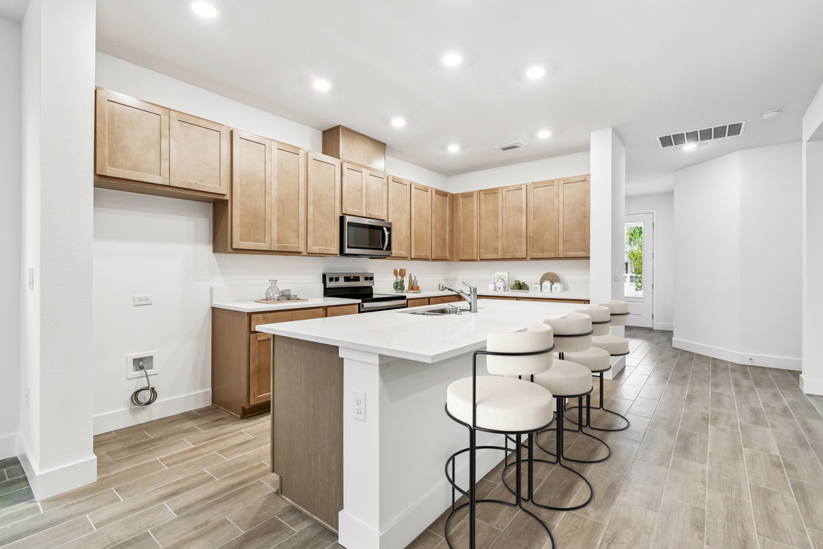 Fall in love with the serene kitchen design, featuring wood-tone cabinets and white quartz countertops. The large island makes the kitchen a true centerpiece, perfect for cooking, gathering, and entertaining.