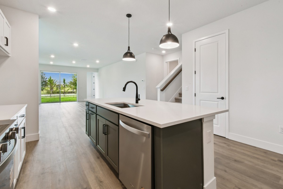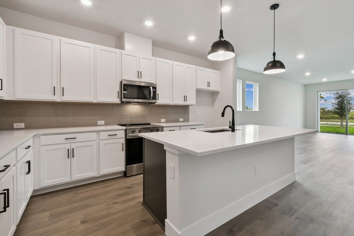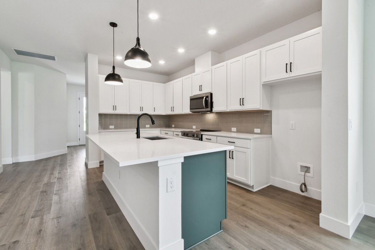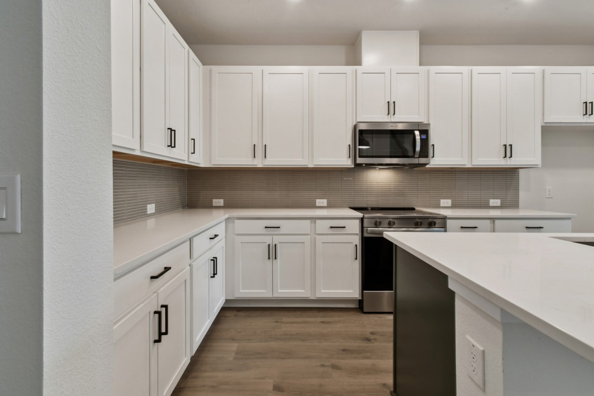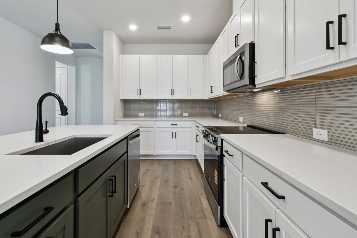 Fall in love with the serene kitchen design, featuring white shaker-style cabinetry paired with a pop of green on the island. White quartz countertops and a gray-accented backsplash complete this functional and stylish space. The large island makes the kitchen a true centerpiece, perfect for cooking, gathering, and entertaining.