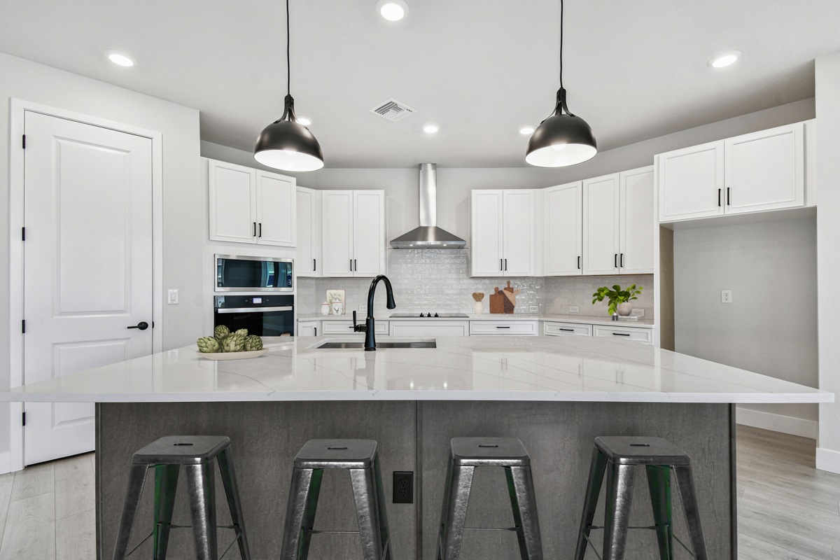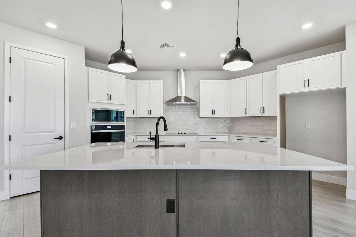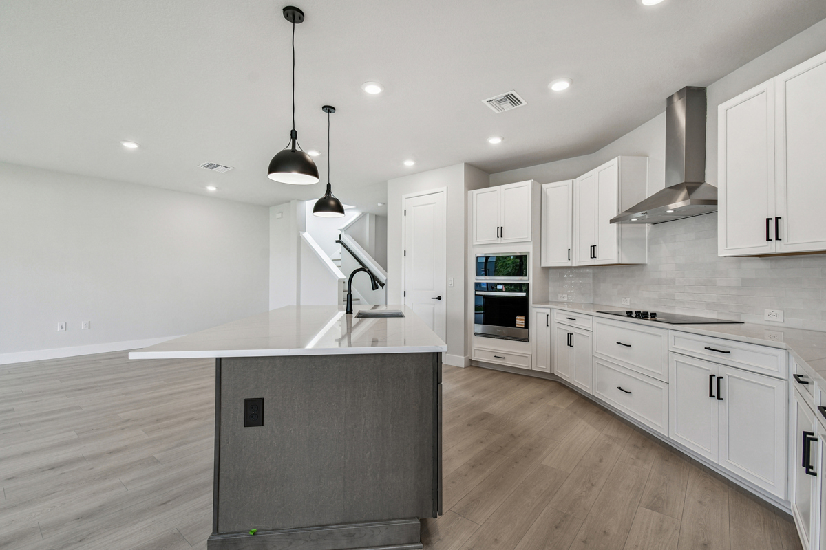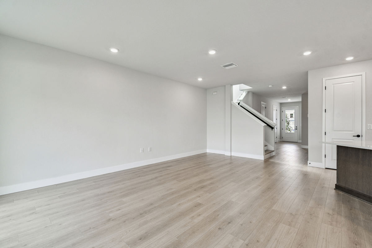 The inviting foyer opens to an expansive floor plan, ideal for both family living and entertaining. The chef-inspired kitchen boasts elegant quartz counter tops, complemented by durable laminate flooring throughout the main living areas.
