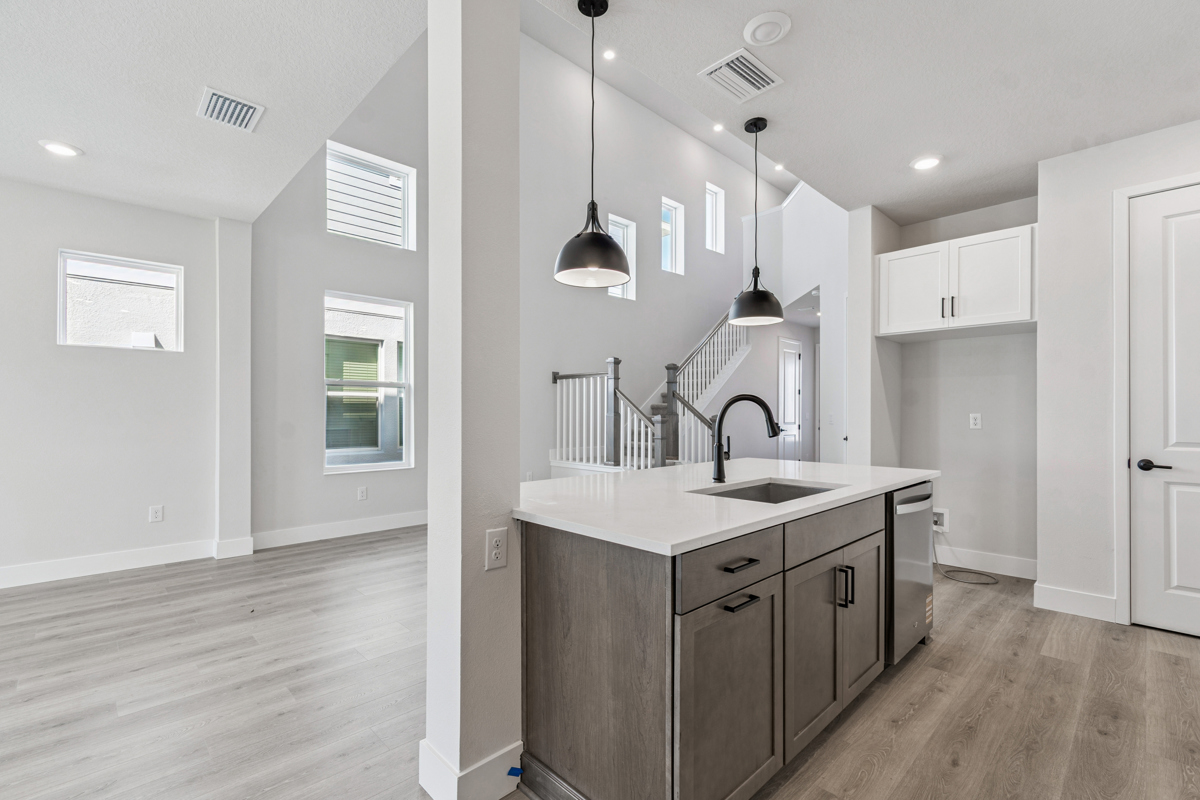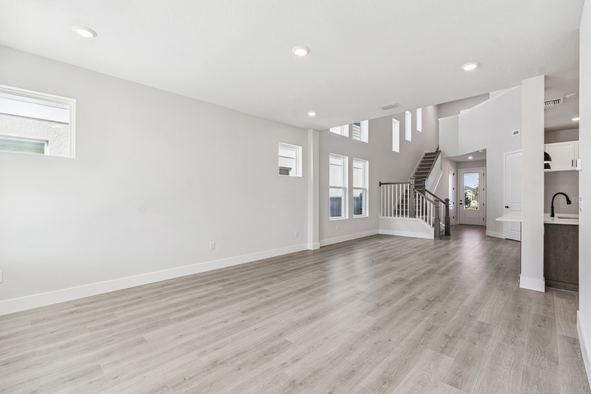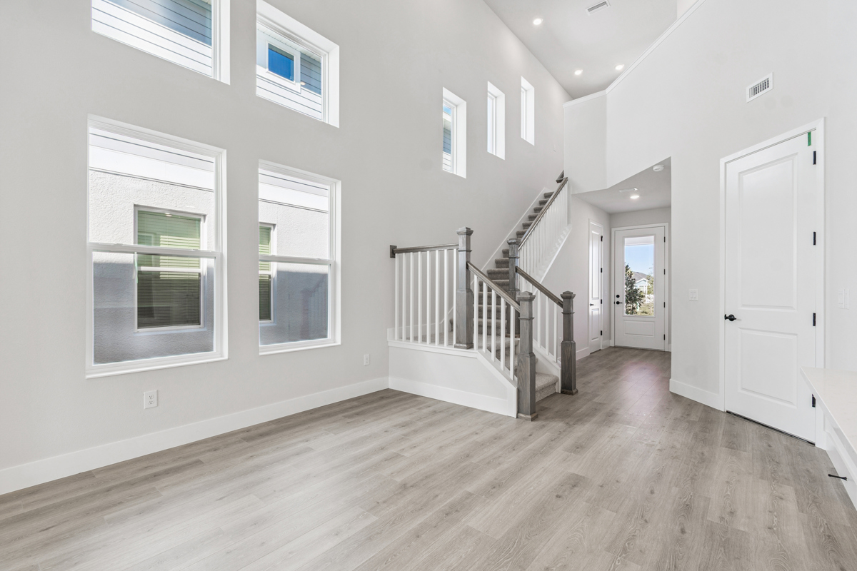 Step inside to soaring 20-foot ceilings and open living areas filled with natural light, creating an inviting atmosphere perfect for both entertaining and daily living. The chef’s kitchen is the heart of the home, featuring sleek quartz countertops, stainless steel built-in appliances, and durable laminate flooring that flows throughout the main living spaces.