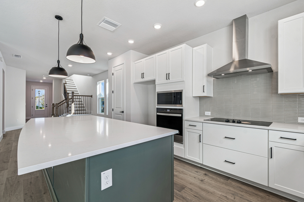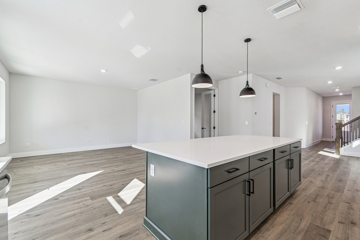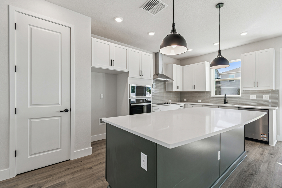 Enjoy a chef-inspired kitchen featuring quartz countertops, sleek cabinetry, and a spacious center island that overlooks a bright, airy living area—perfect for hosting friends and family. Durable laminate flooring flows through the main living spaces, combining style with everyday practicality.