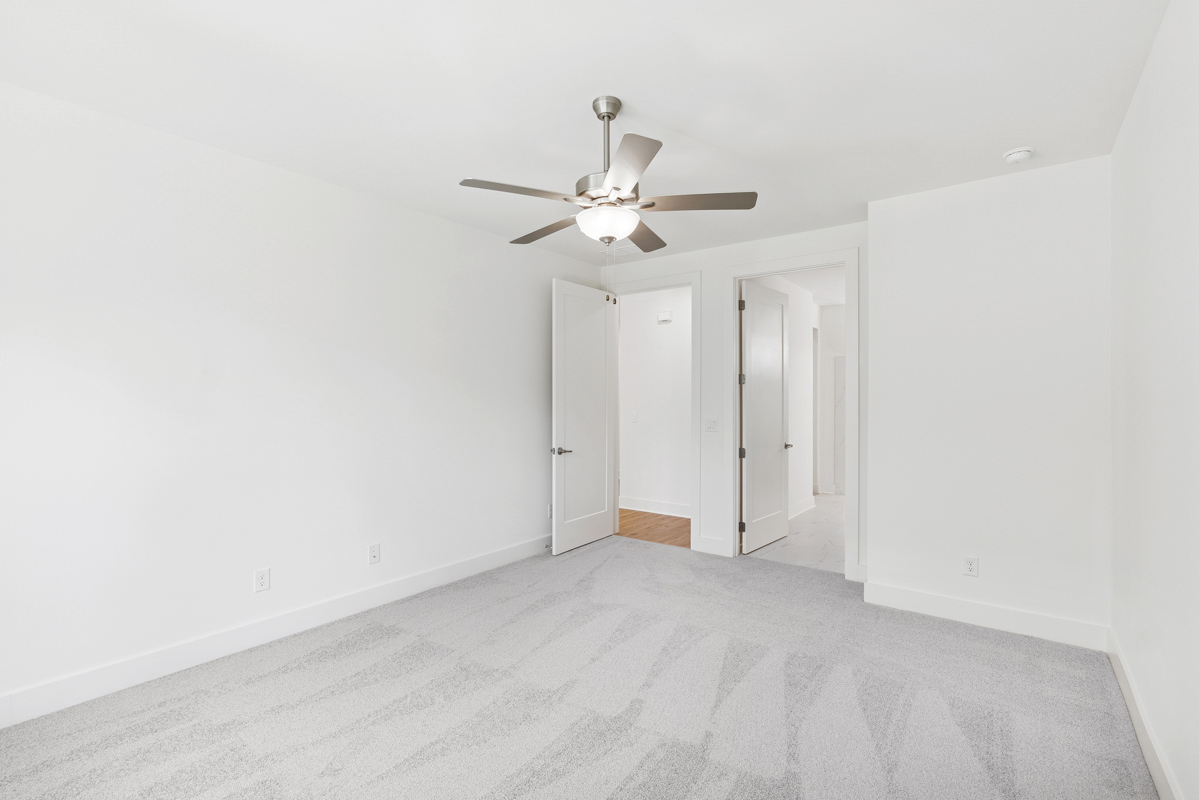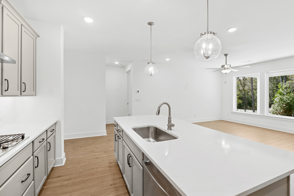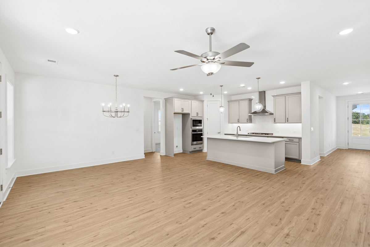 You begin your morning on the front porch, coffee in hand, as the sun rises behind the home’s crisp white siding and charcoal-accented roofline. The home’s clean lines, black trim, and welcoming presence reflect a sense of calm and simplicity. As you step through the front door, you're greeted by a bright, open interior, where soft shell white walls and driftwood-toned luxury plank flooring create a natural flow through the main living areas.
