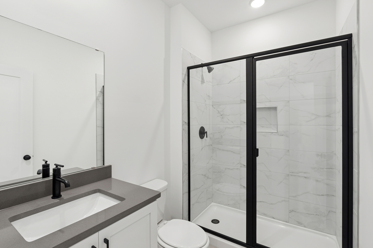 All homes in Celesta include three levels, with a guest bedroom and full bath on the garage level and either two or three additional bedrooms on the top floor. This home is the Brexton plan, offering four bedrooms and three-and-a-half bathrooms.