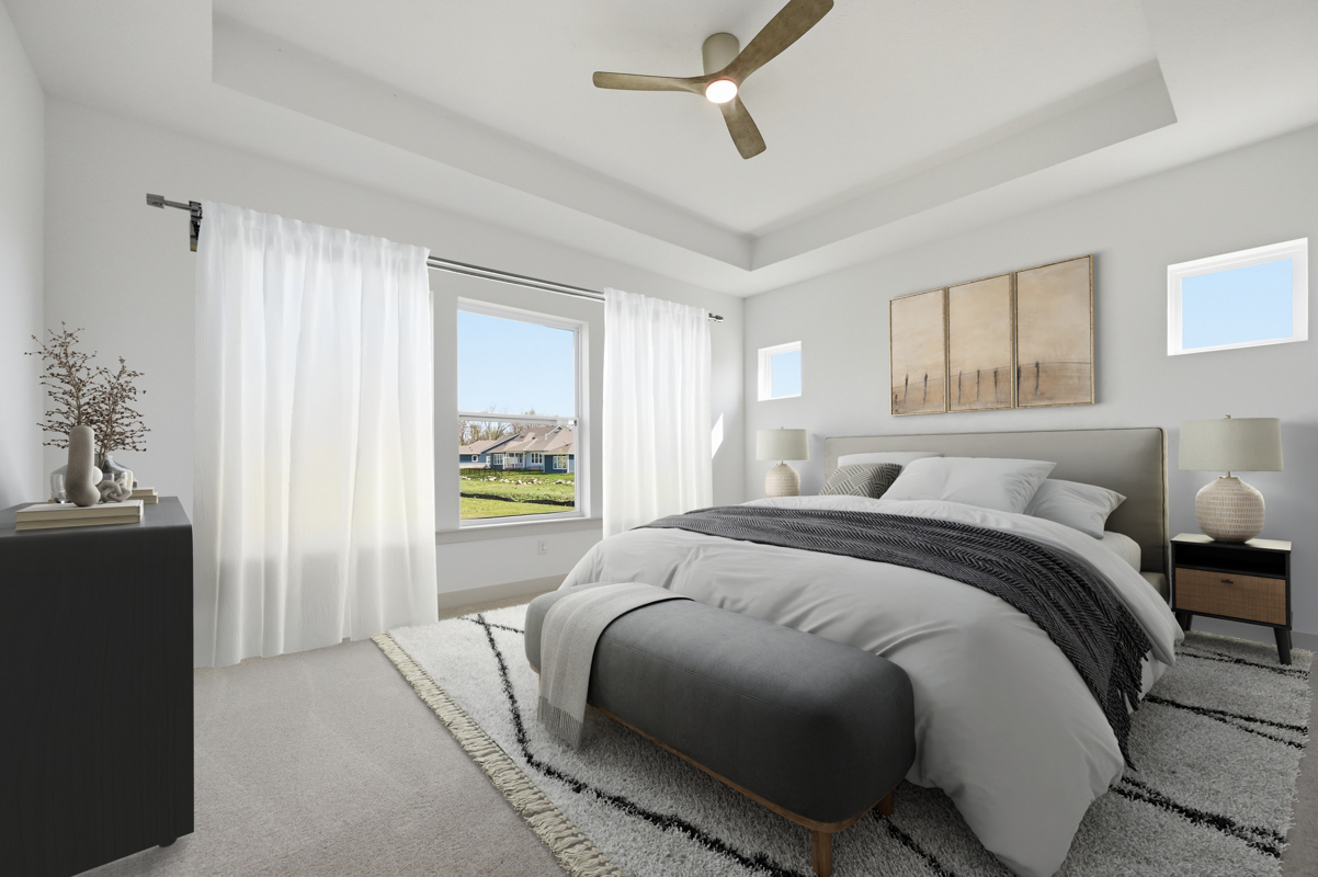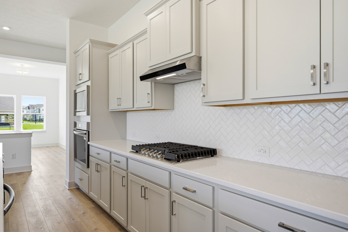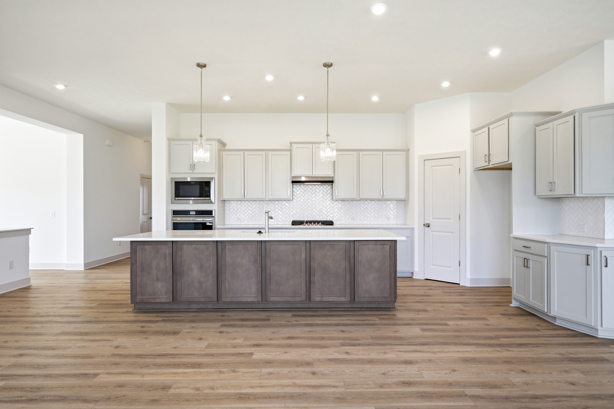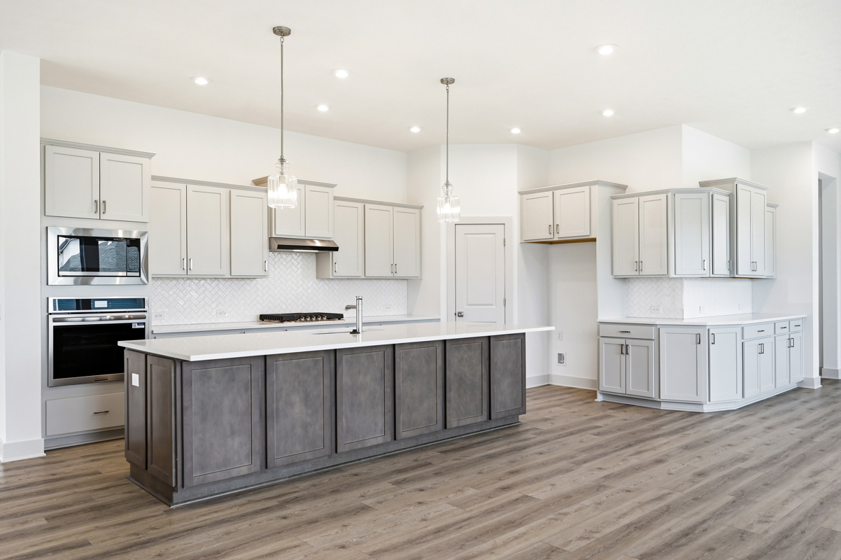 The main level features an open layout with soaring ceilings, abundant natural light, and upgraded cabinetry paired with sleek quartz countertops throughout. The gourmet kitchen impresses with a large island, walk-in pantry, and generous storage, creating the ideal space for family meals and gatherings.