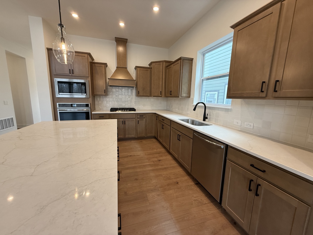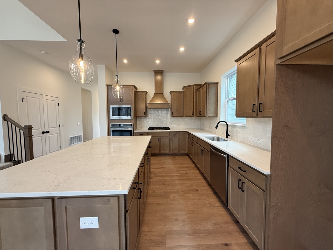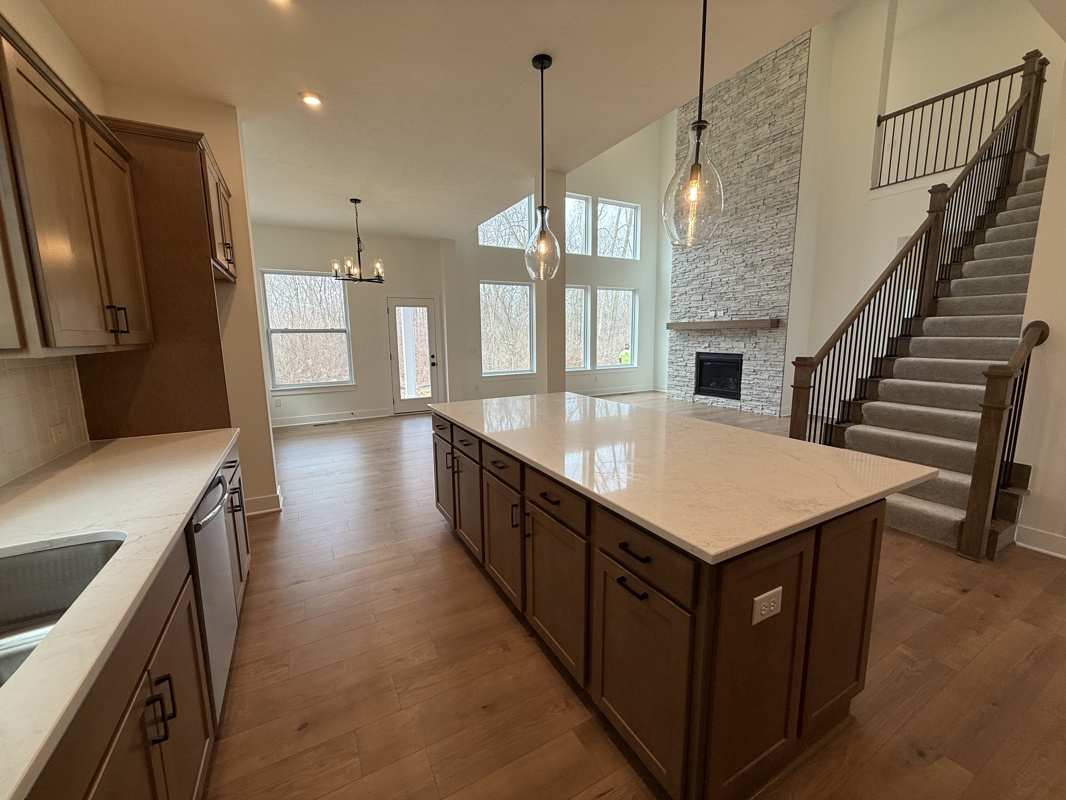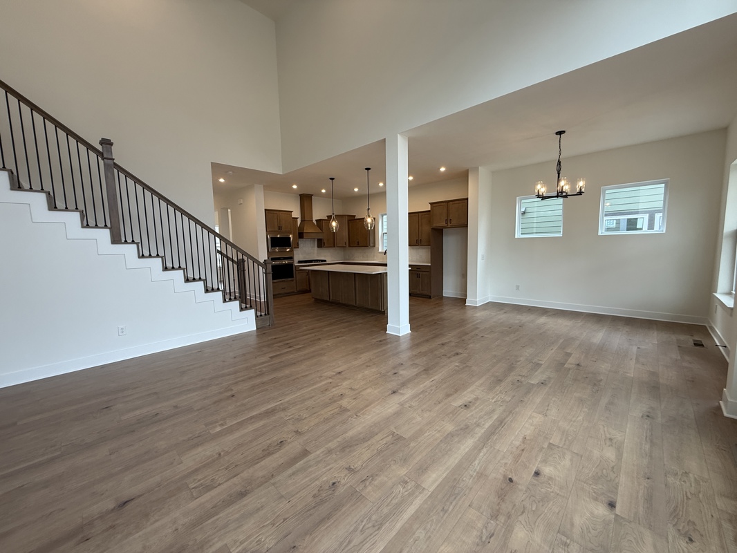 Dramatic vaulted ceilings soaring more than 20 feet create an open, airy atmosphere, while thoughtful upgrades throughout add lasting value. The gourmet gallery kitchen features quartz countertops and upgraded laminate wood flooring.