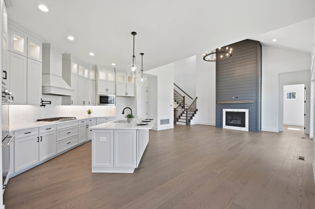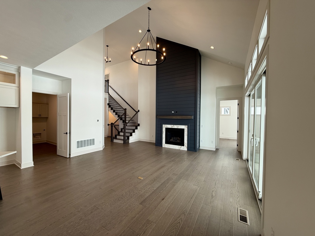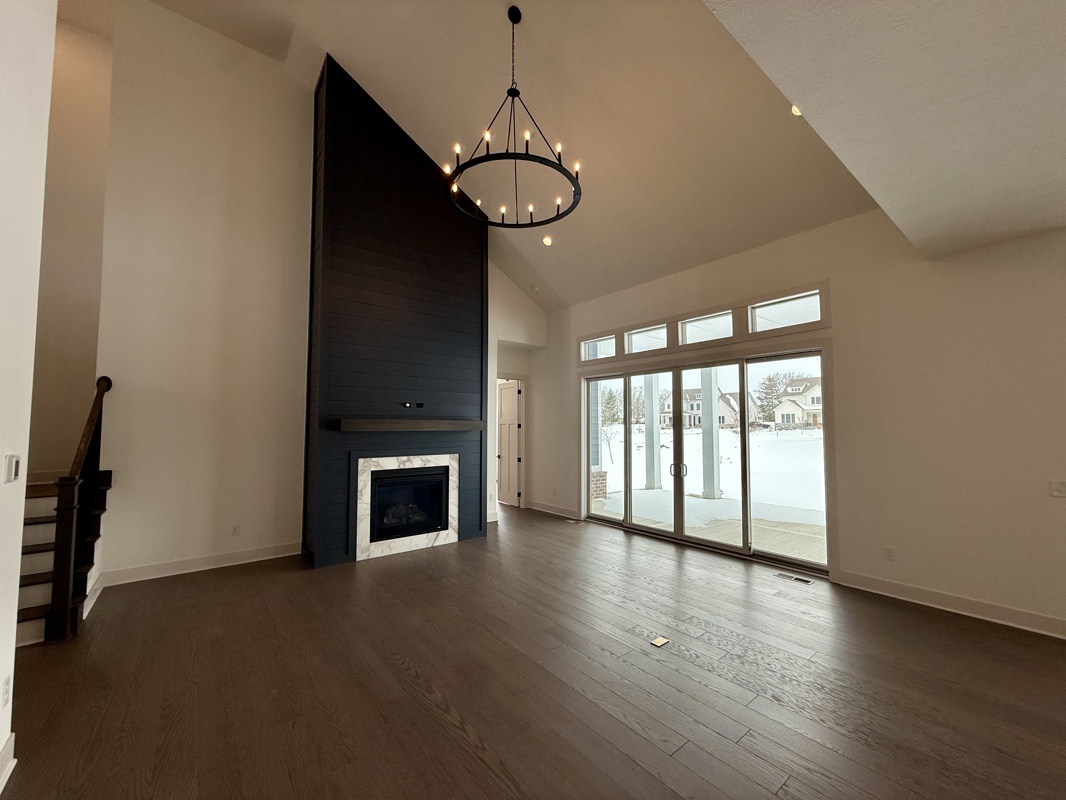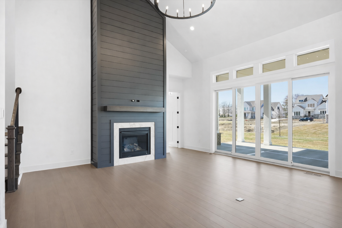 At the heart of the home, the open-concept family room features a striking stone-surround fireplace and an impressive 12-foot sliding glass door that opens to an extended covered rear porch—perfect for seamless indoor-outdoor living and year-round enjoyment.