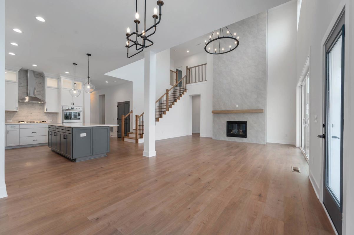 The two-story family room is filled with natural light, anchored by a striking tile-surround fireplace that creates a warm and inviting focal point. A 12-foot sliding glass door opens to an extended covered rear porch, seamlessly blending indoor and outdoor living for year-round enjoyment.