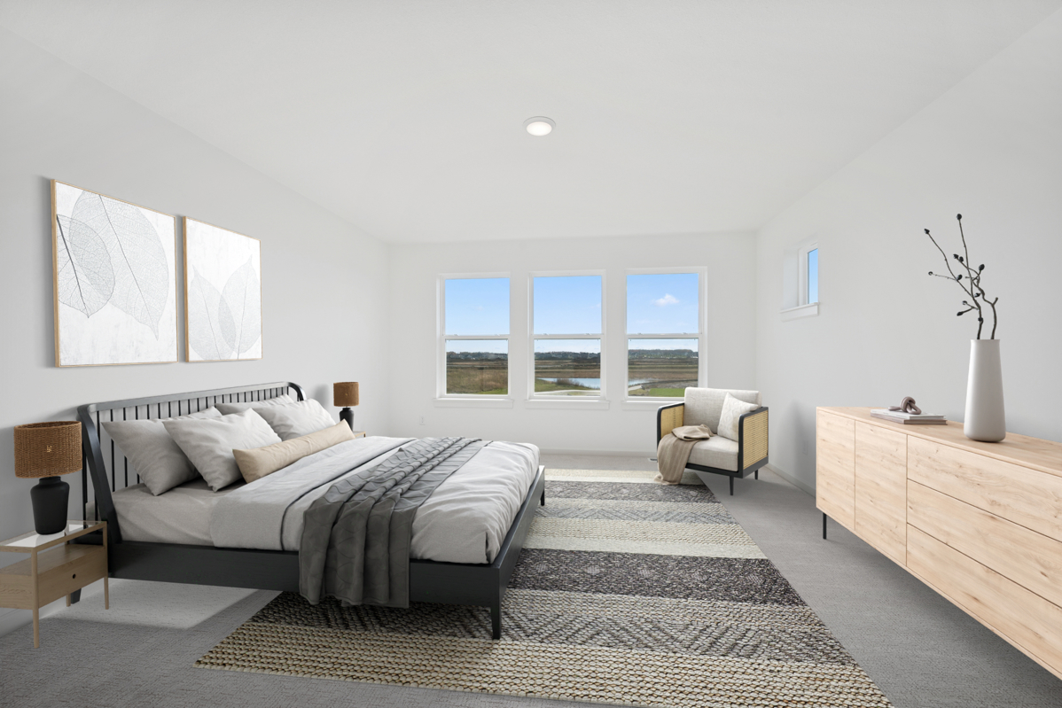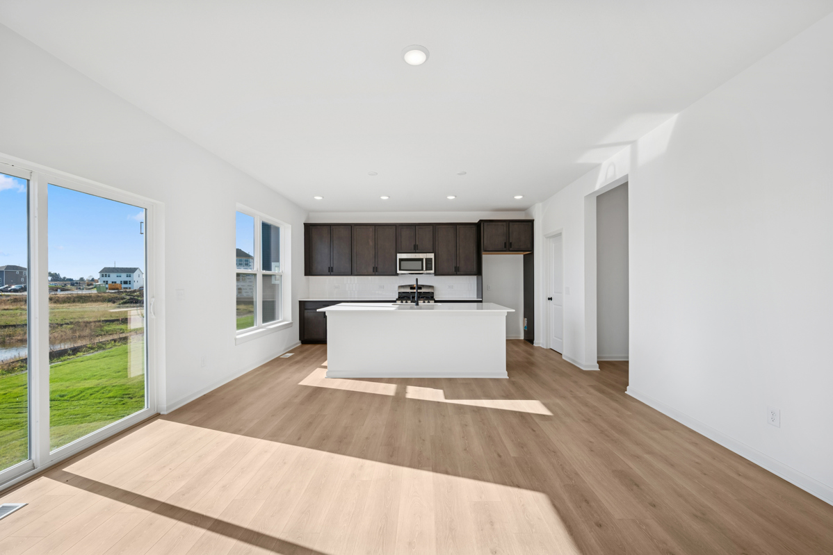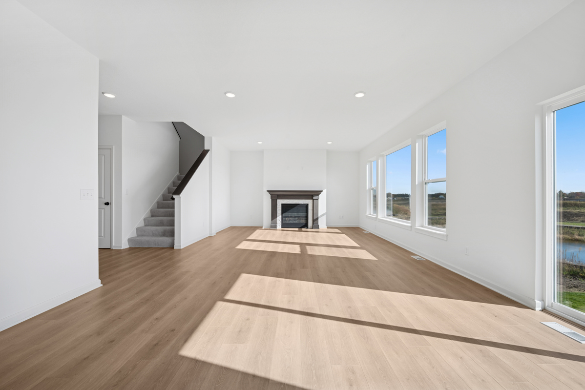 The Ontario by David Weekley Homes has an open and airy feeling with 9' tall ceiling on the main floor and huge windows with sight lines that extend through the sunny living spaces to view the big pond in the back.