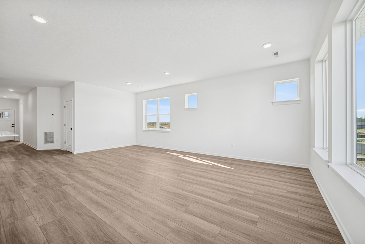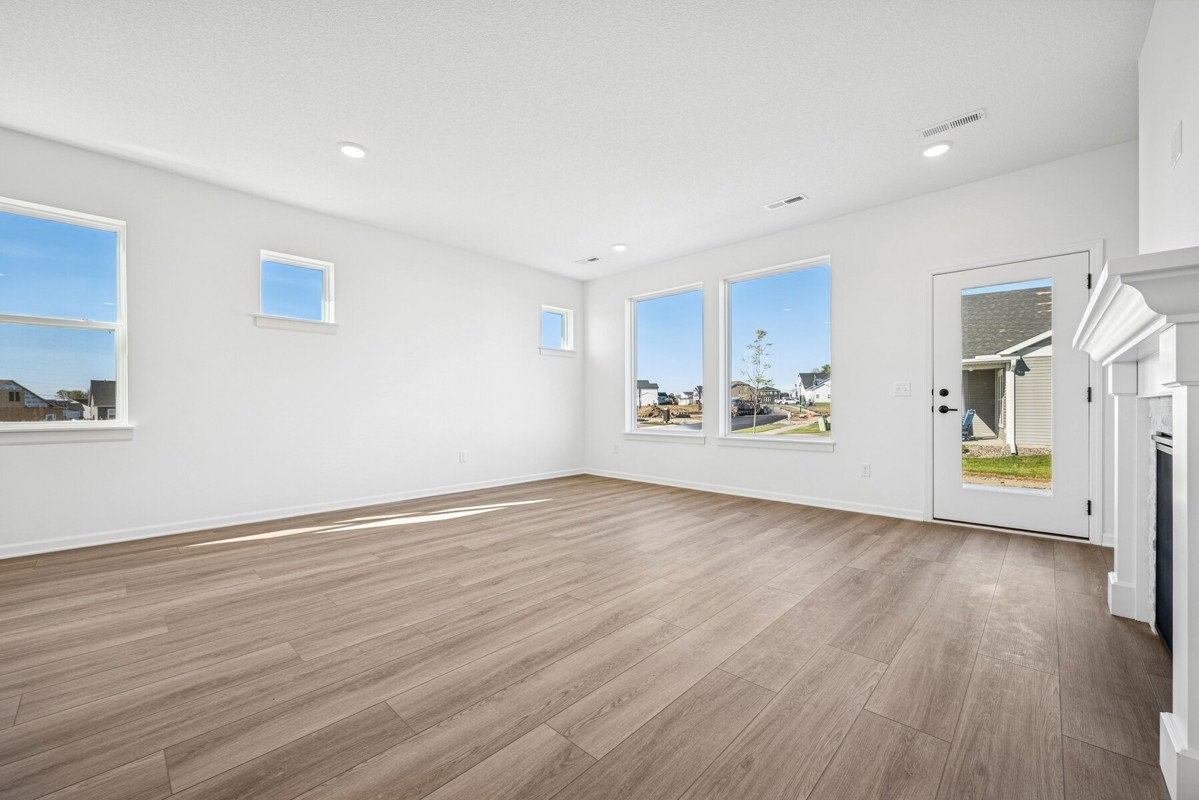 The spacious family room is perfectly suited for a large television above the electric fireplace, creating a cozy spot to unwind, watch the game or enjoy a movie night.