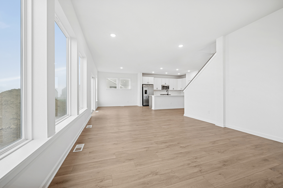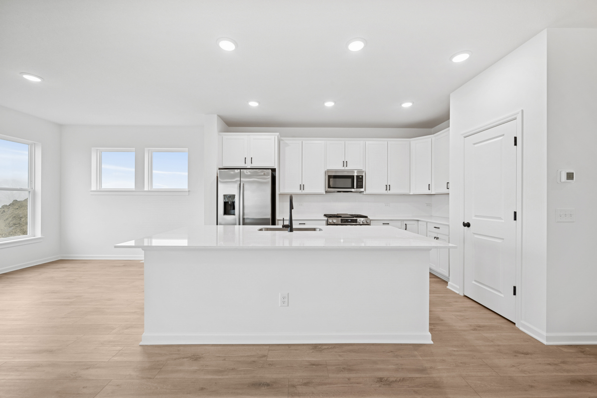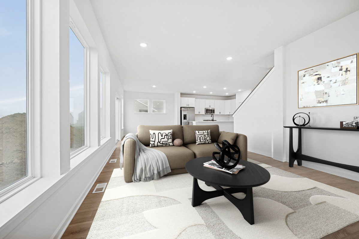 This home features a spacious main level designed for entertaining, highlighted by many large windows and a central kitchen island.