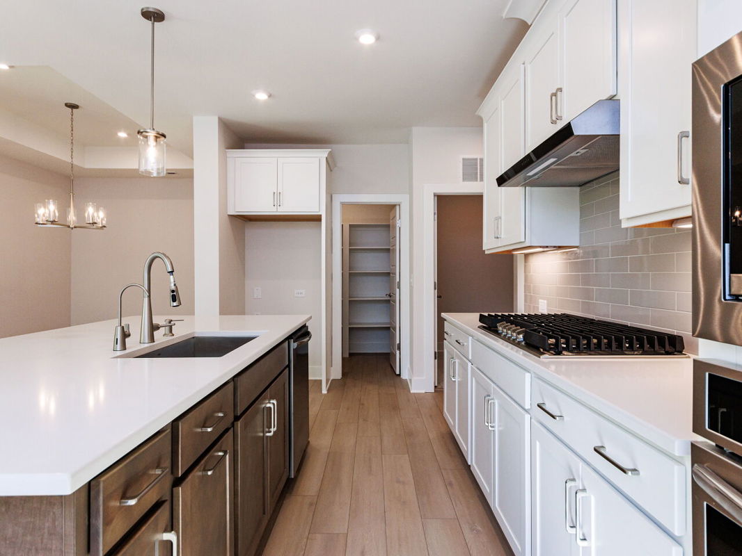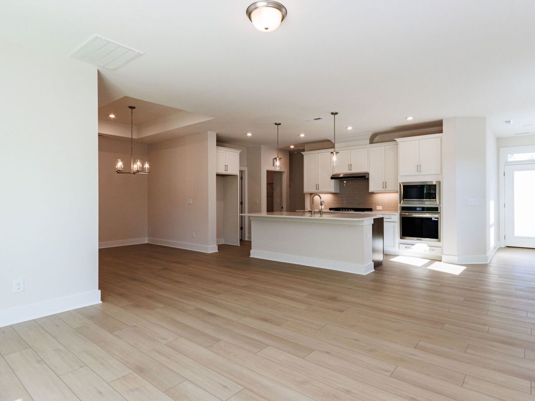Welcome to The Ambition, a paired ranch villa positioned in the sought-after Encore at Chatham Park. This beautifully designed home blends ease, comfort, and style. Step through an inviting front courtyard into a bright, open floor plan where the heart of the home is a gourmet kitchen featuring a gas cooktop, wall oven, large working island, and ample walk-in pantry — perfect for everyday living and entertaining alike.