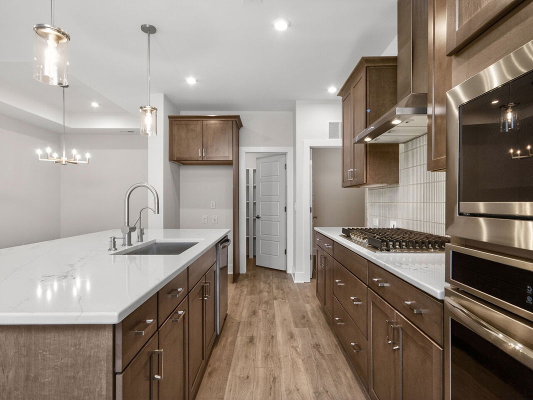 At the heart of the home, the gourmet kitchen impresses with a gas cooktop, built-in wall oven, spacious working island, and an expansive walk-in pantry — the perfect blend of form and function. The kitchen flows seamlessly into the dining and family areas, creating a naturally connected space that feels as warm as it is practical.