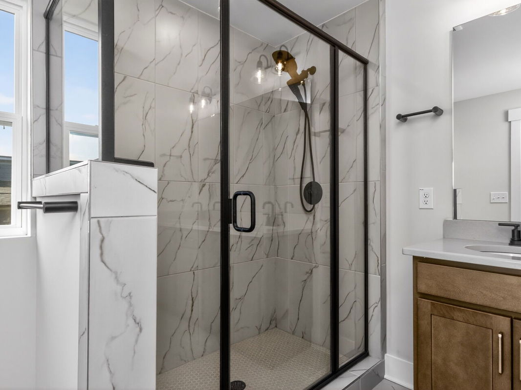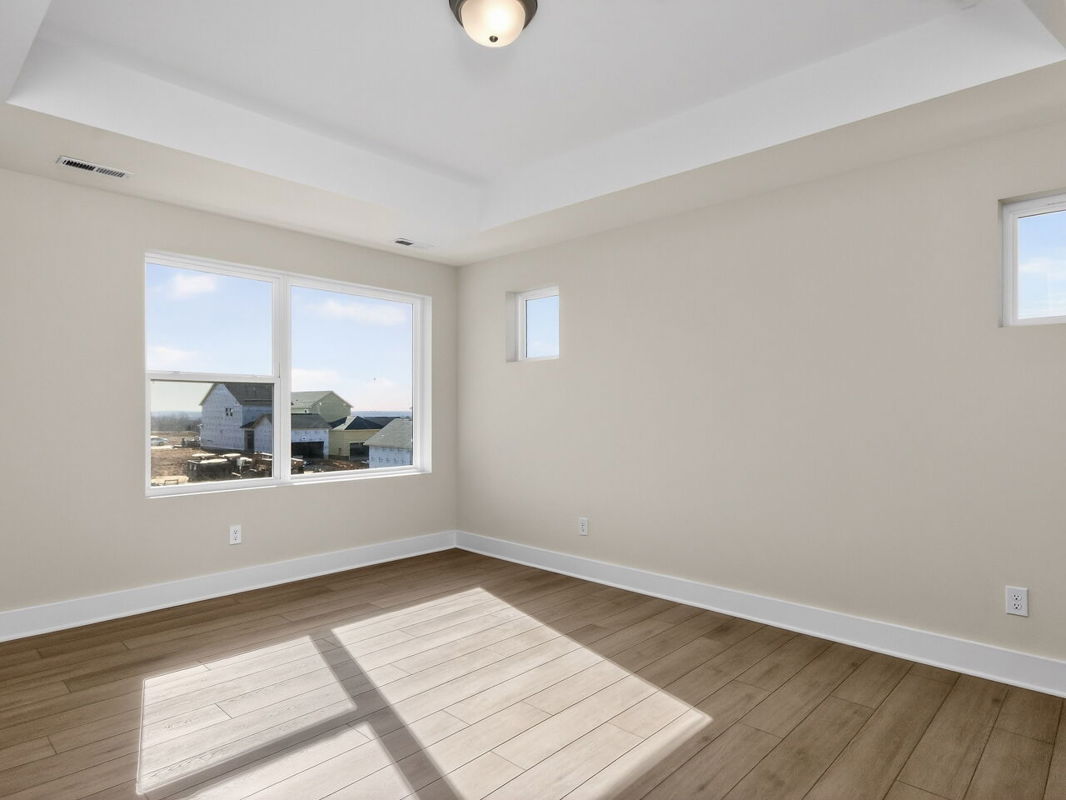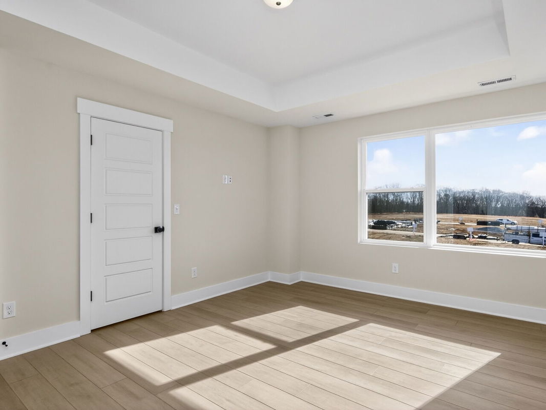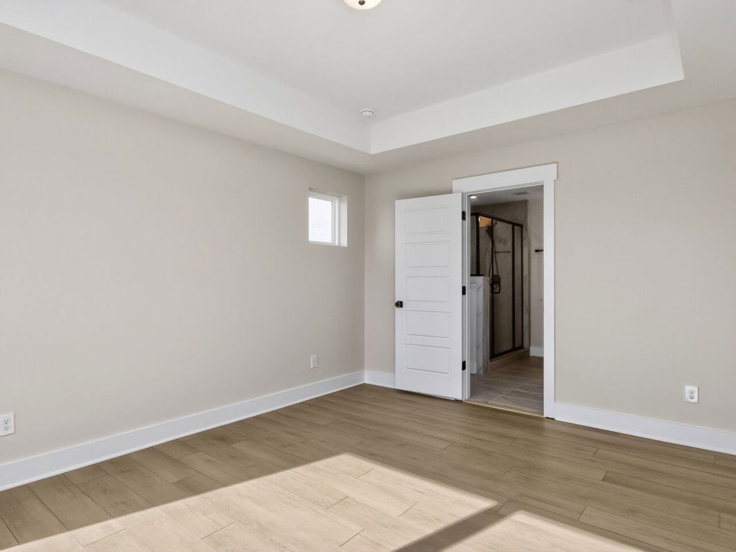 The luxurious Owner's Suite provides a peaceful retreat with a spa-like en-suite bathroom, a spacious walk-in closet, and window view of the covered porch.
