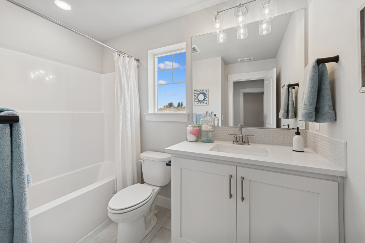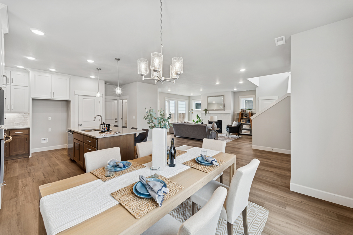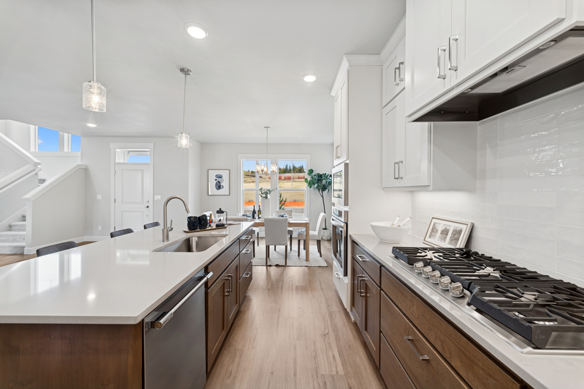 The front door opens onto an expansive view of the sunny and spacious primary living areas, while big, energy-efficient windows connect the family room to the breezy covered porch. A mutli-function island and adjacent dining area add streamlined ease to the stylish kitchen. We've added ceiling height cabinets for extra drama.