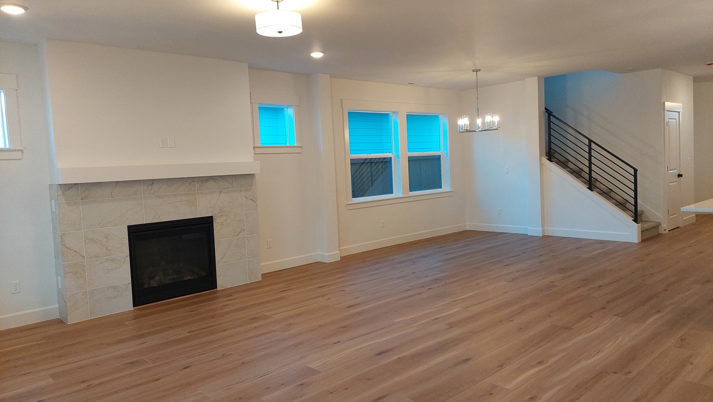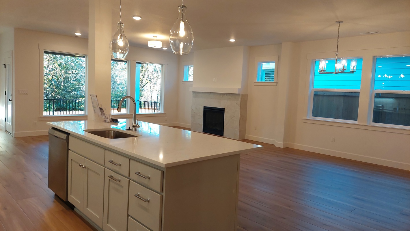 The contemporary finishes of the island kitchen include painted cabinetry, hard surface flooring, tiled backsplash and quartz countertops in contemporary tones of watery greys and white. An upstairs retreat or loft space provides another area for media or recreation away from the Great Room.