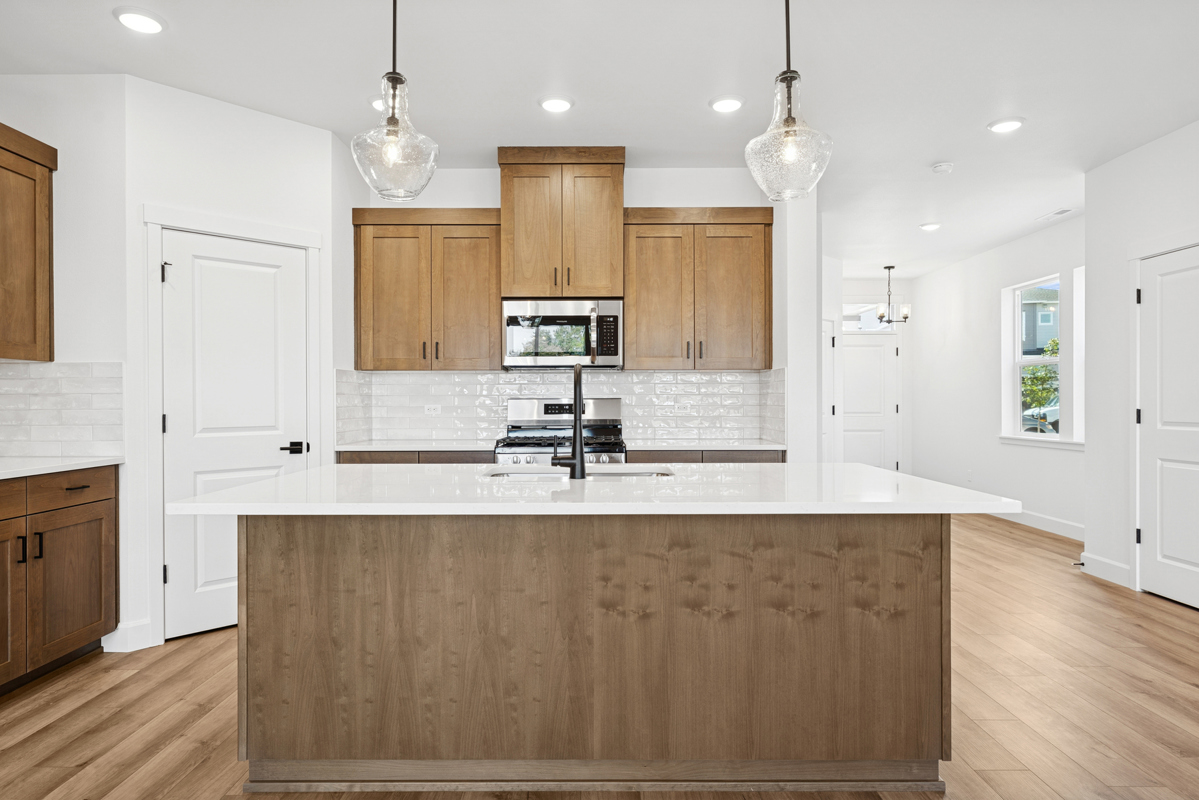 Inside, natural light fills the home through Milgard windows, enhancing the open and airy feel of the main living areas. The designer kitchen is both beautiful and functional, with quartz countertops, stylish cabinetry, and ample prep space—perfect for everyday meals or entertaining friends and family.