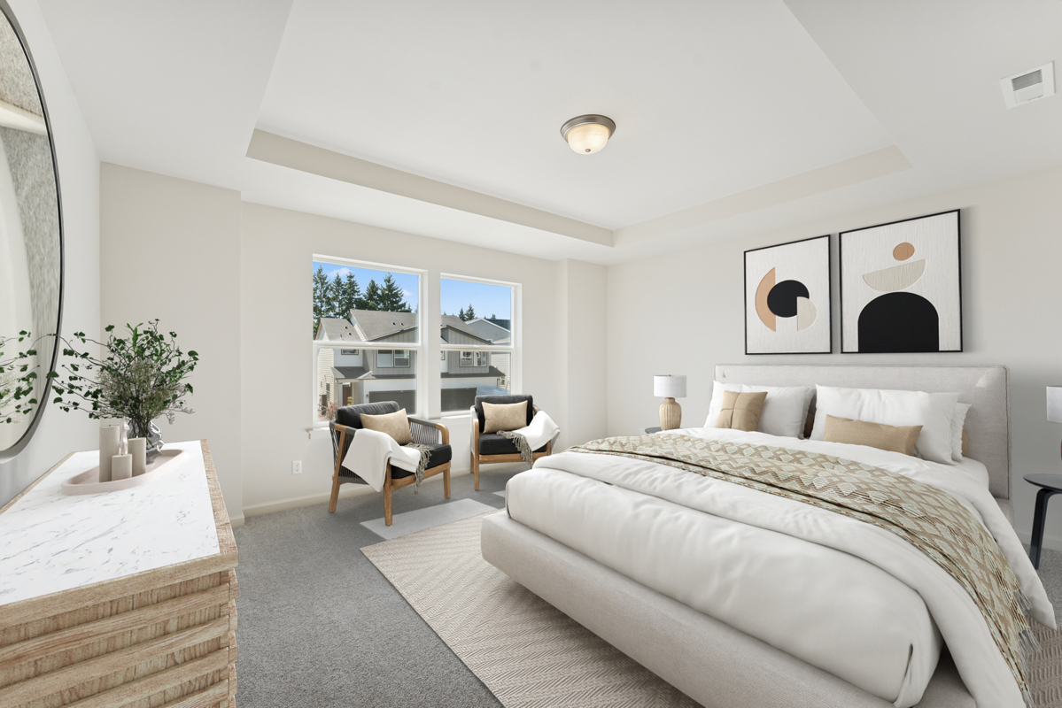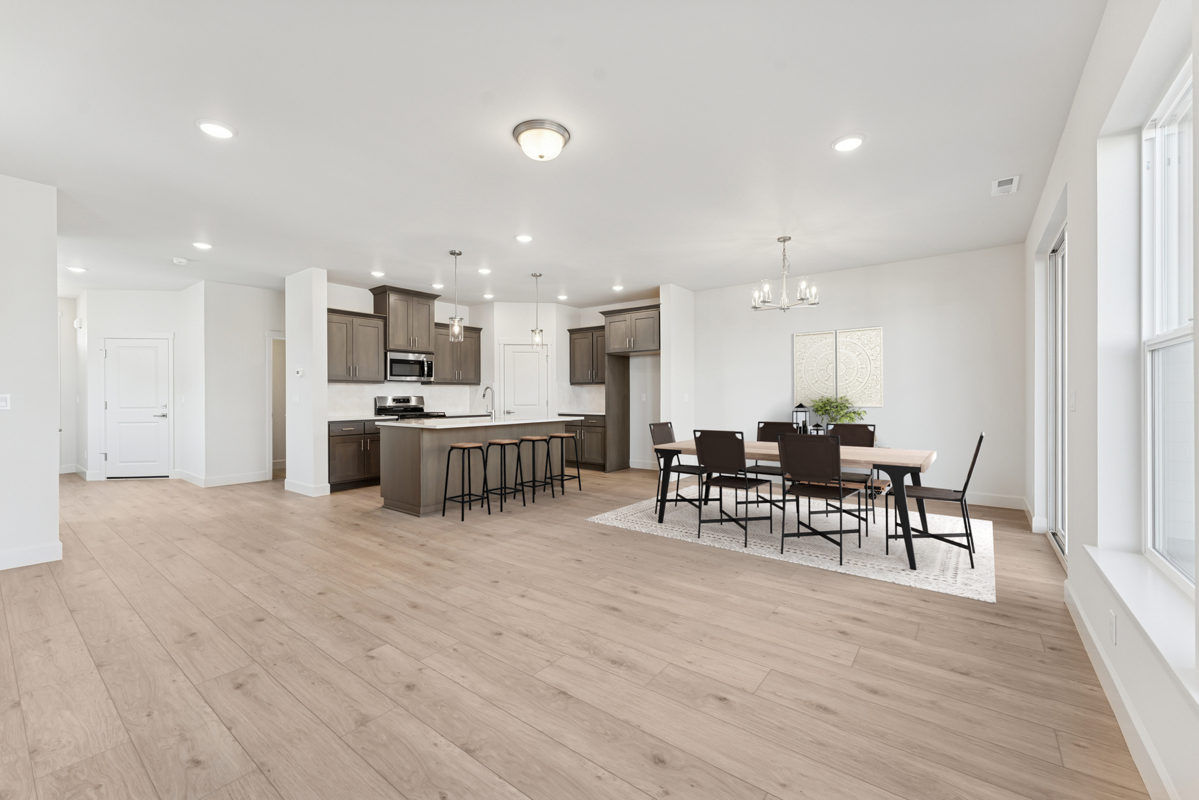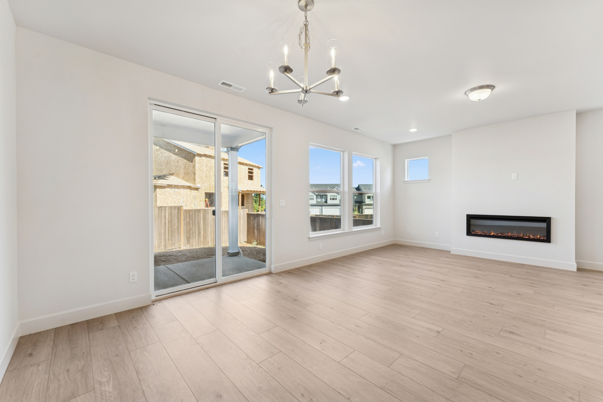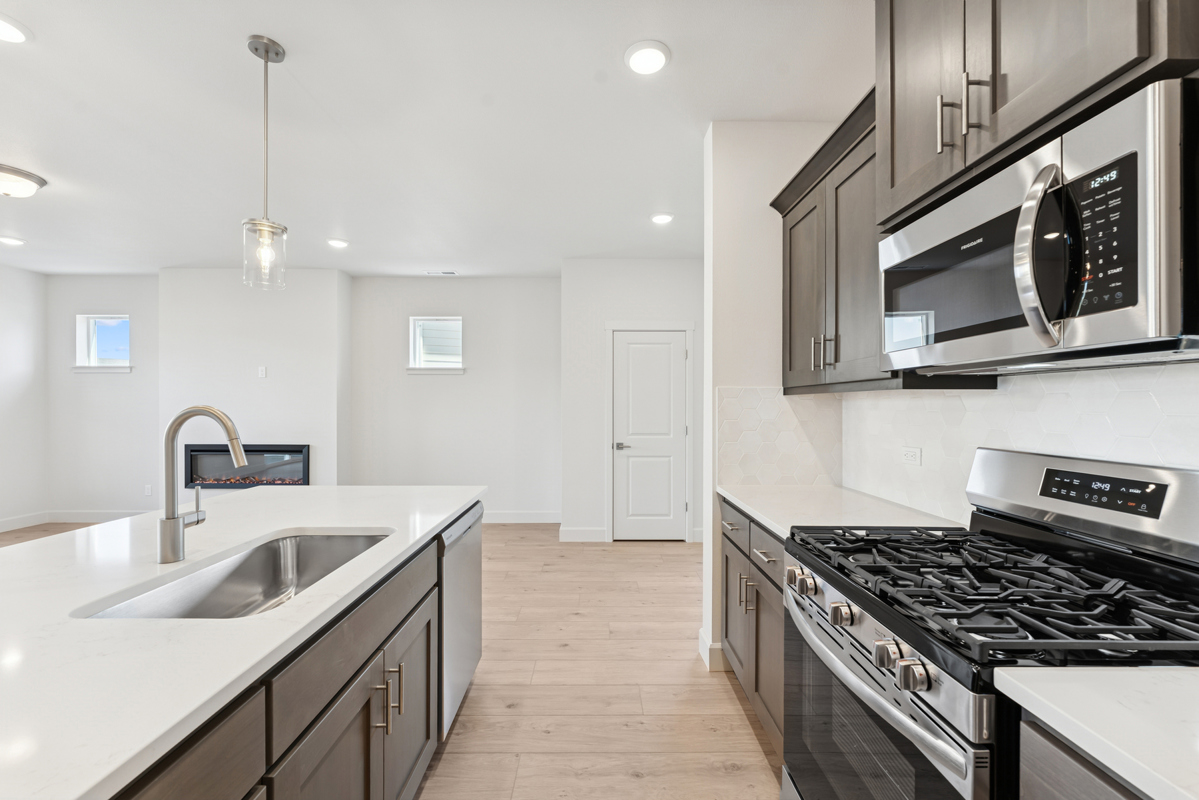 Inside, Milgard windows fill the space with natural light, highlighting the designer kitchen with quartz countertops and stylish cabinetry. The open-concept layout is both functional and inviting, ideal for everyday living or entertaining.