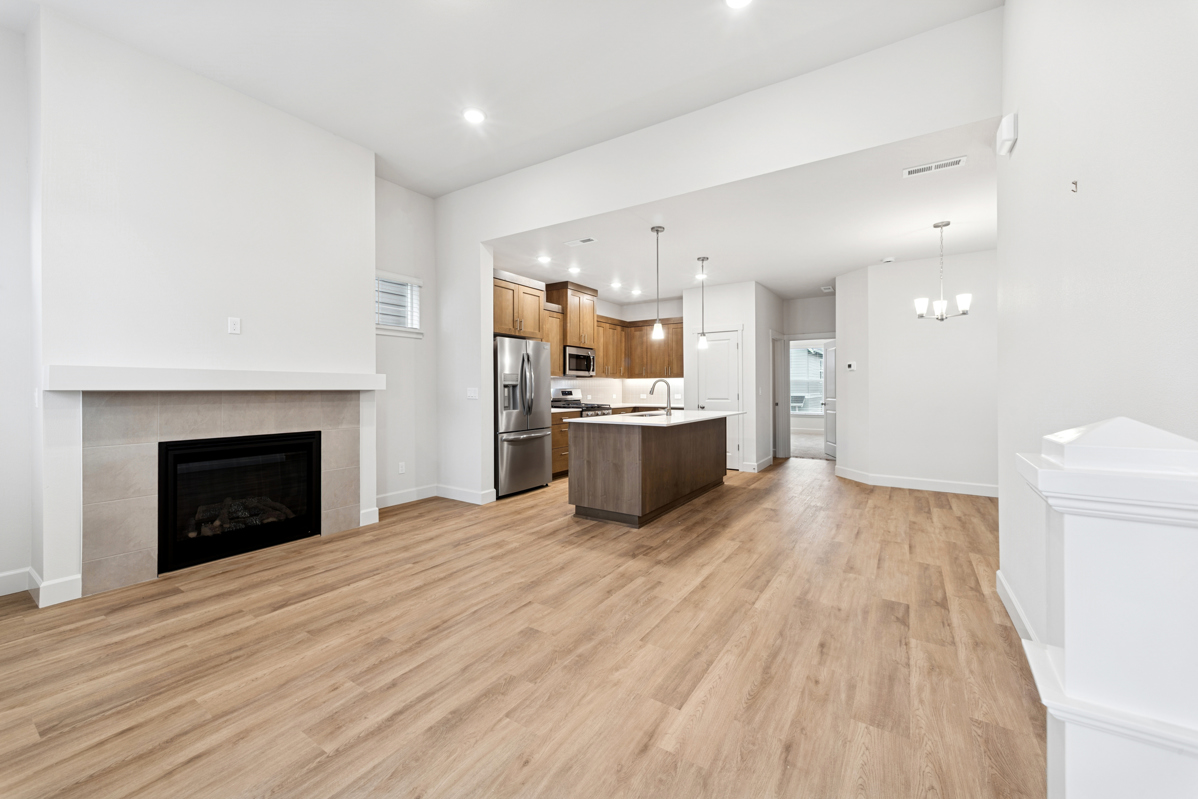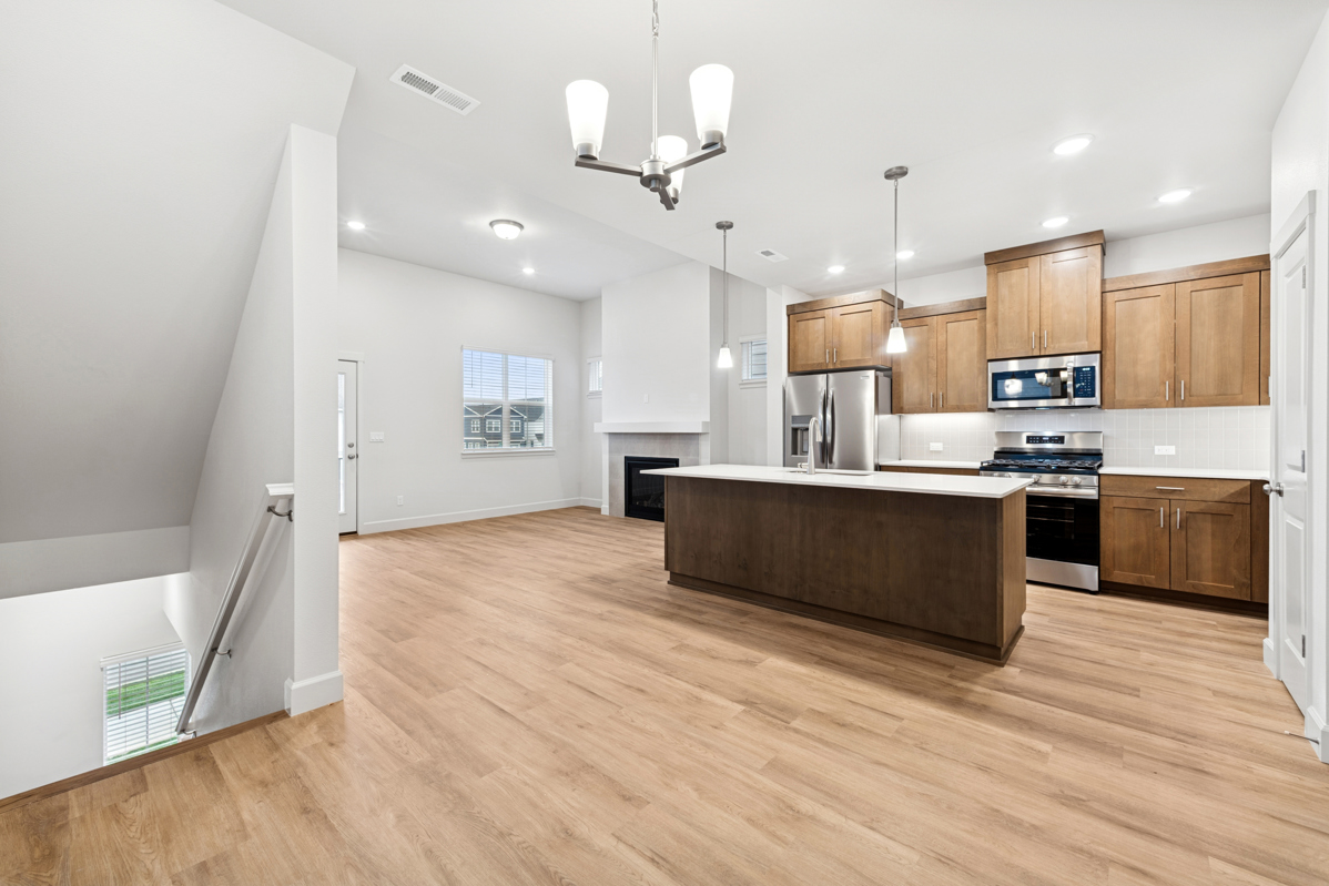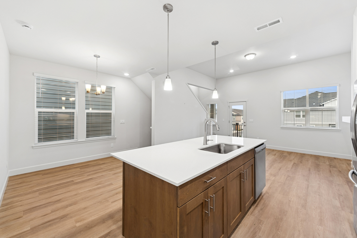 Sunlight shines on the open and inviting family and dining areas from the energy-efficient windows that frame the charming balcony. The chef’s kitchen provides a dine-up island and plenty of storage and prep space.