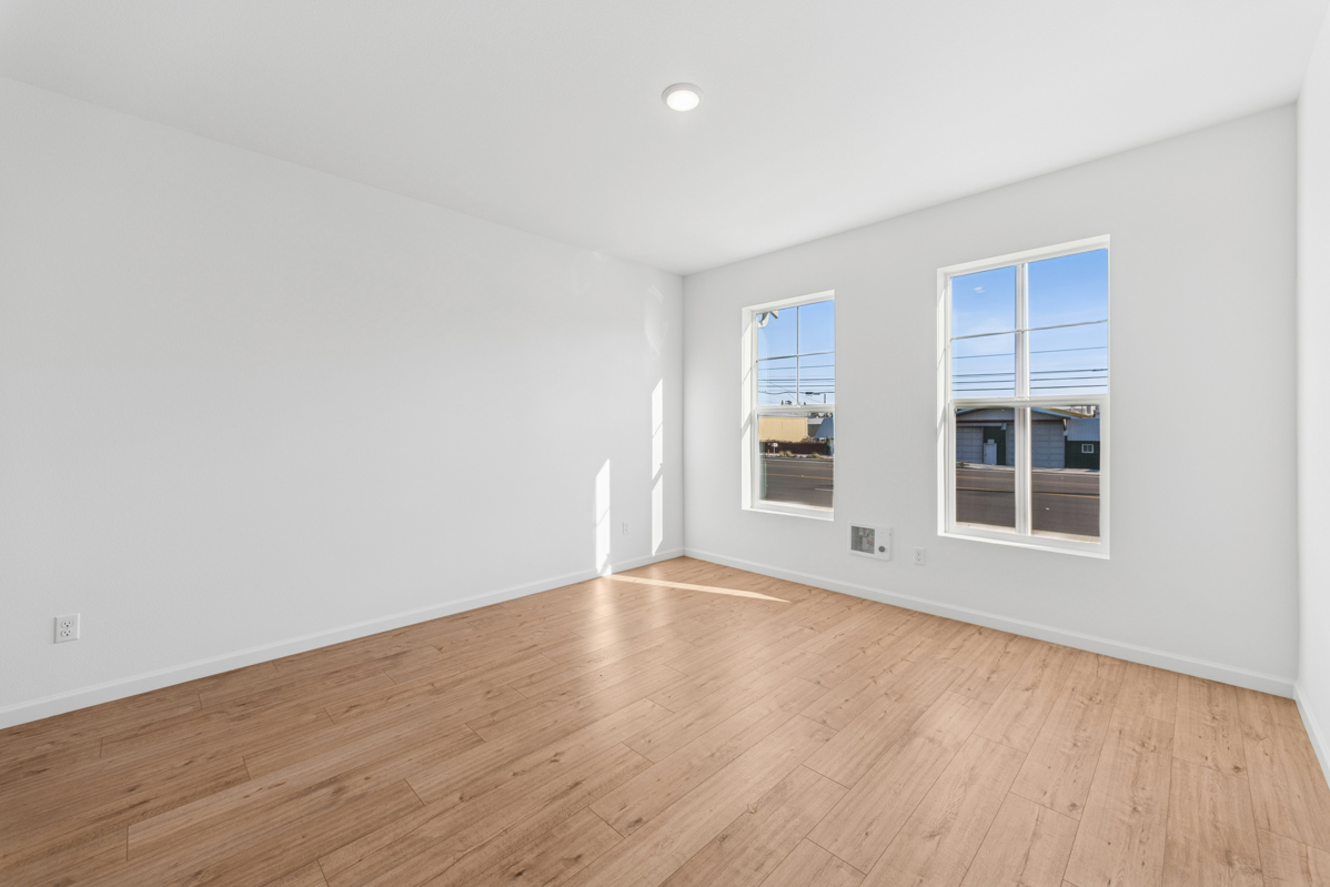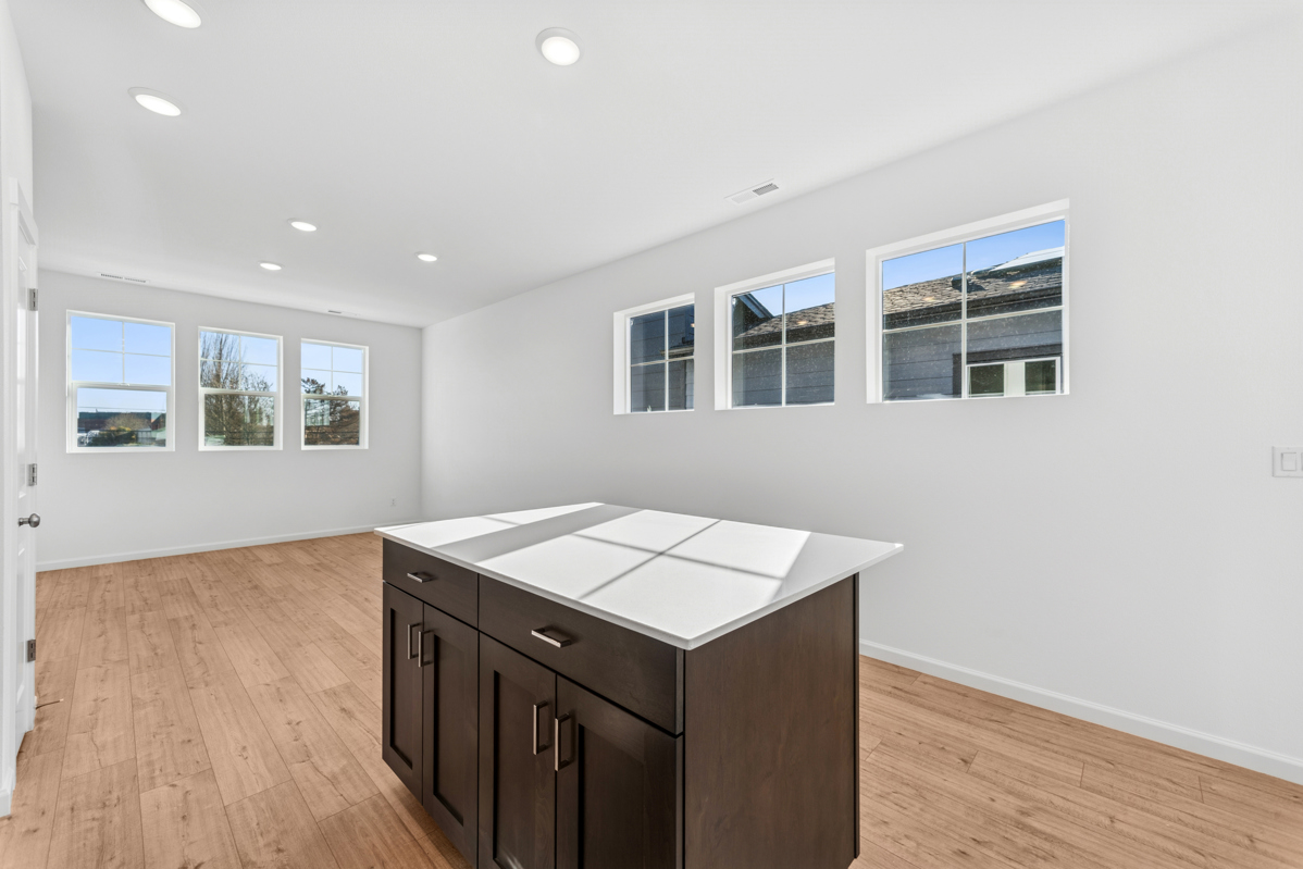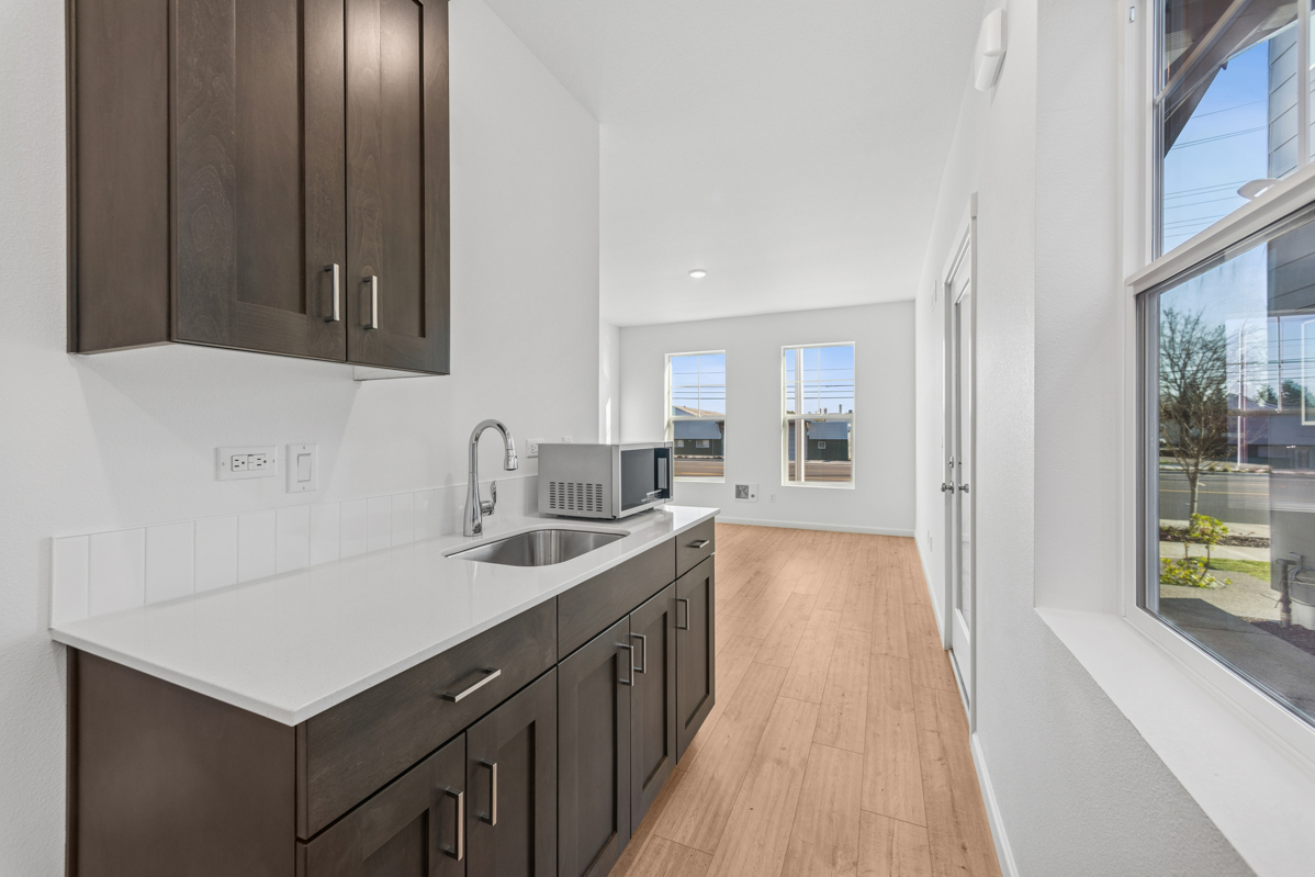 Upstairs, the spacious 1-bed residence features stained custom cabinetry, light natural-toned flooring, and sleek nickel hardware for a warm, contemporary aesthetic. Large windows bring in abundant natural light, creating an inviting, open feel.