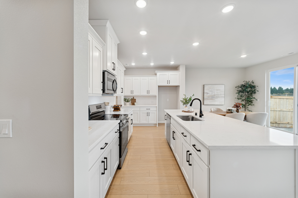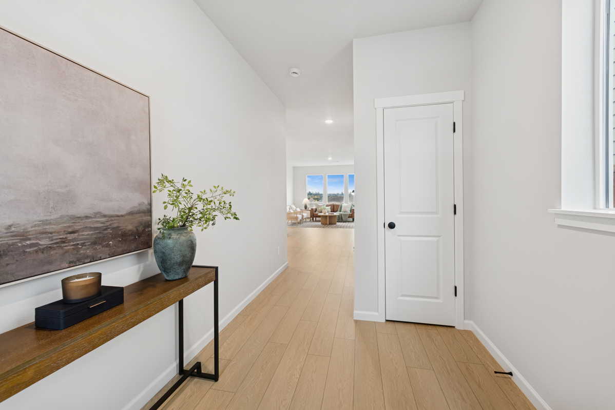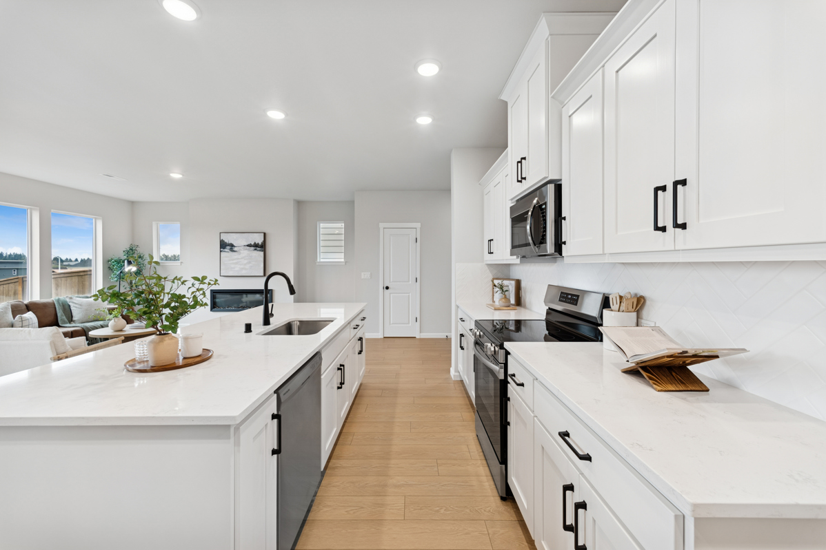 Welcome to The Bridlemile! This home offers a spacious, bright, and welcoming entry with abundant natural light streaming in through large oversized windows. Beautiful design upgrades throughout include white painted kitchen and bathroom cabinetry, luxury vinyl flooring, upgraded 3CM quartz counters, and black hardware on all cabinetry, doors, and fixtures.