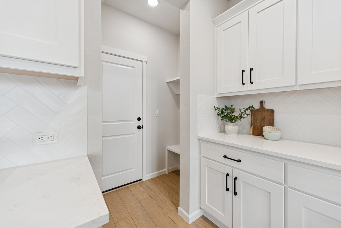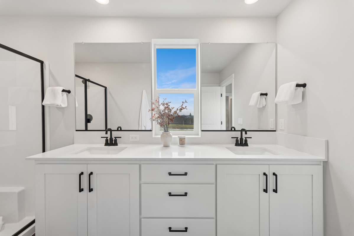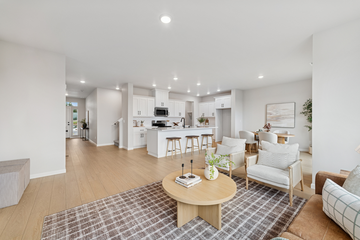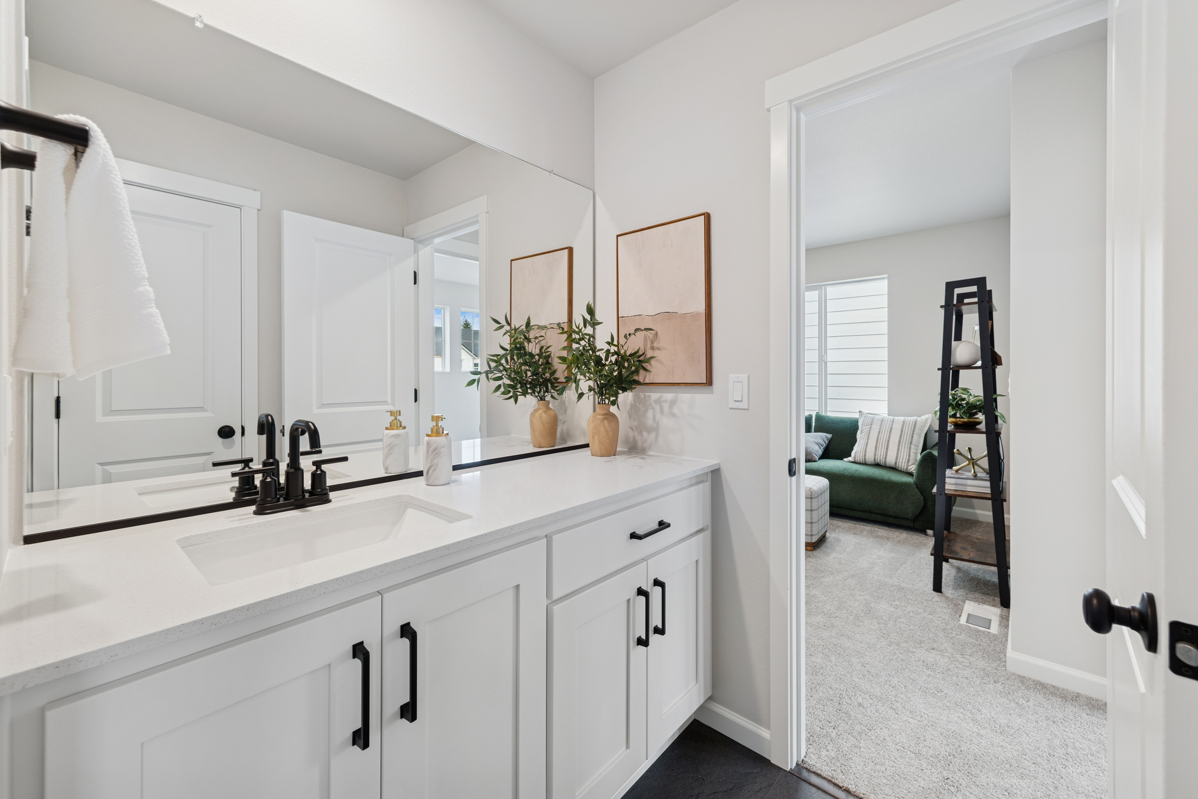 Welcome to The Bridlemile! This home offers a spacious, bright, and welcoming entry with abundant natural light streaming in through large oversized windows. Beautiful design upgrades throughout include white painted kitchen and bathroom cabinetry, luxury vinyl flooring, upgraded 3CM quartz counters, and black hardware on all cabinetry, doors, and fixtures.