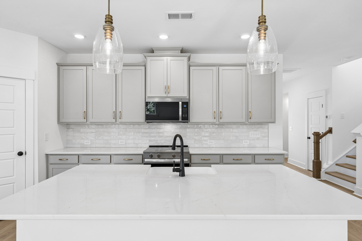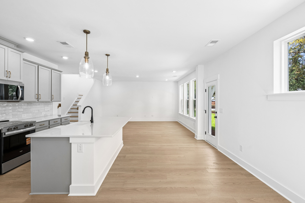 The bright, open floor plan provides plenty of space for gathering with family and friends. The kitchen features ample prep space and a large center island overlooking the family and dining areas. From morning coffee to evening cocktails, homework sessions to holiday buffets, this island is destined to be the heart of the home.