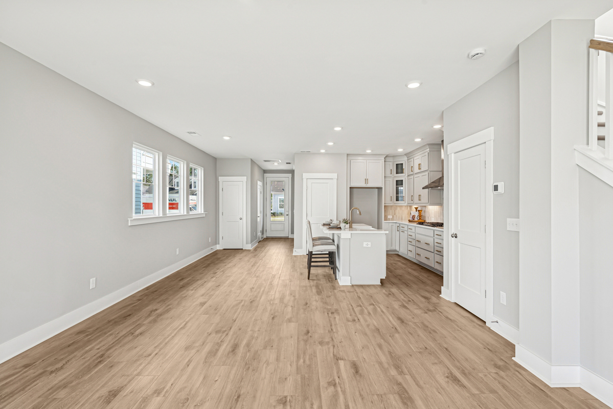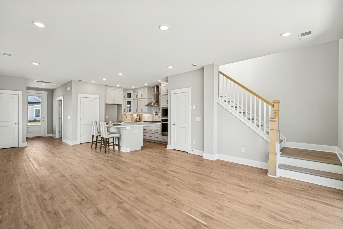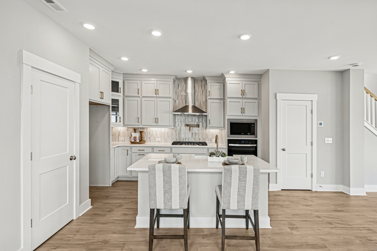 The gourmet kitchen is fit for a chef, with double-stacked cabinets extending to the ceiling. The center island is a hub for new memories—whether for casual conversations, holidays, or everyday projects.