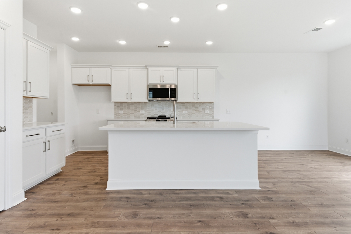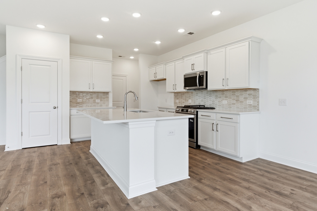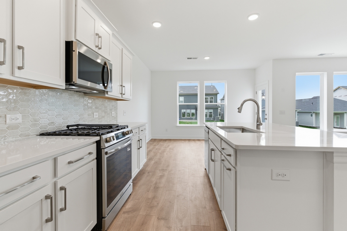 Comfort and luxury inspire every lifestyle refinement of The White Oak by David Weekley Homes. A multi-function island and expansive view of the sunny living and dining spaces contribute to the culinary layout of the glamorous kitchen.