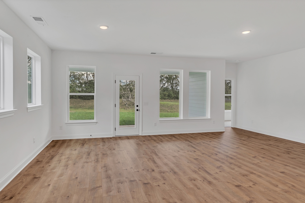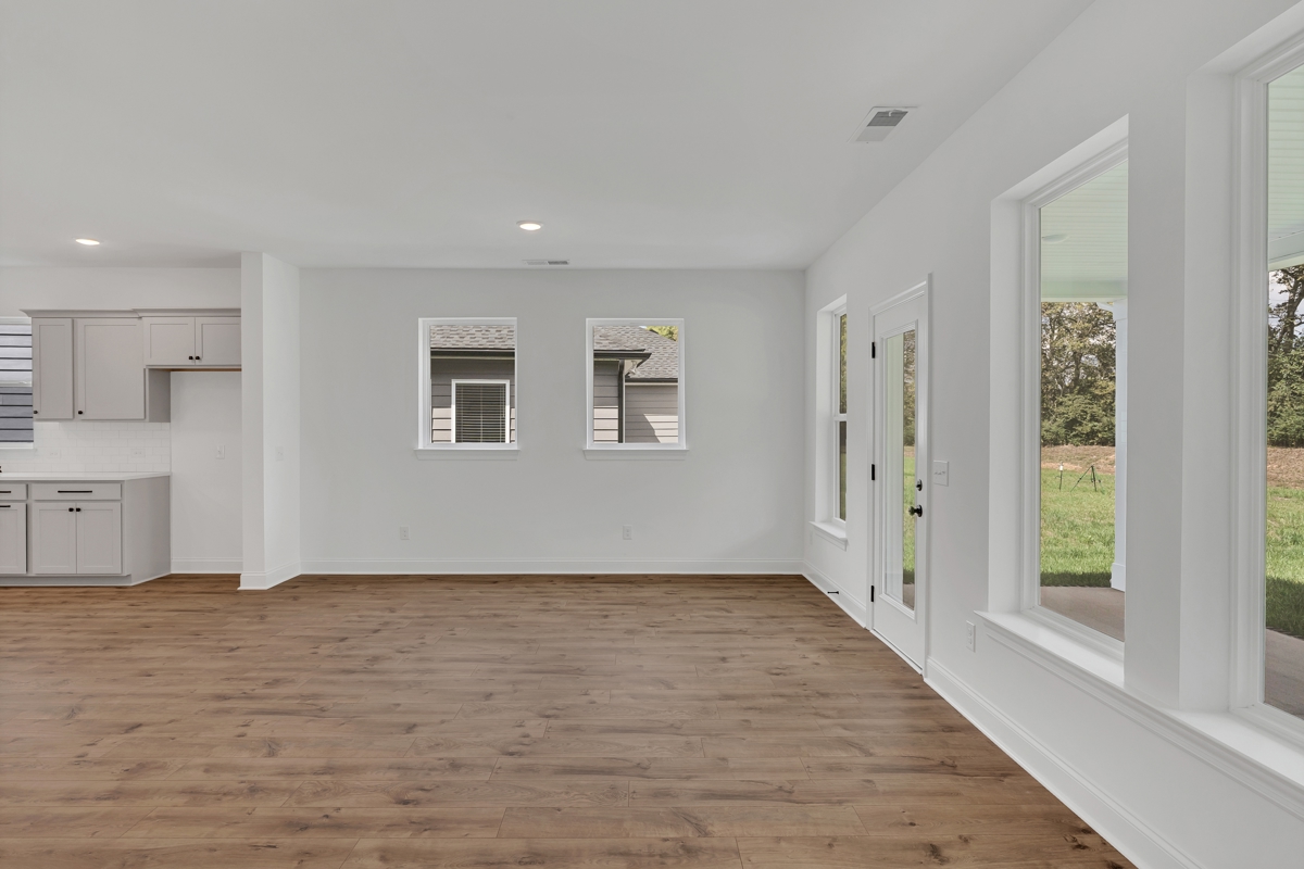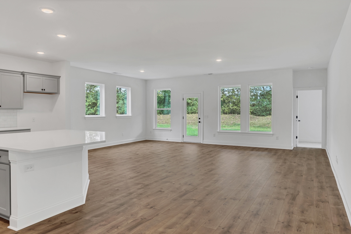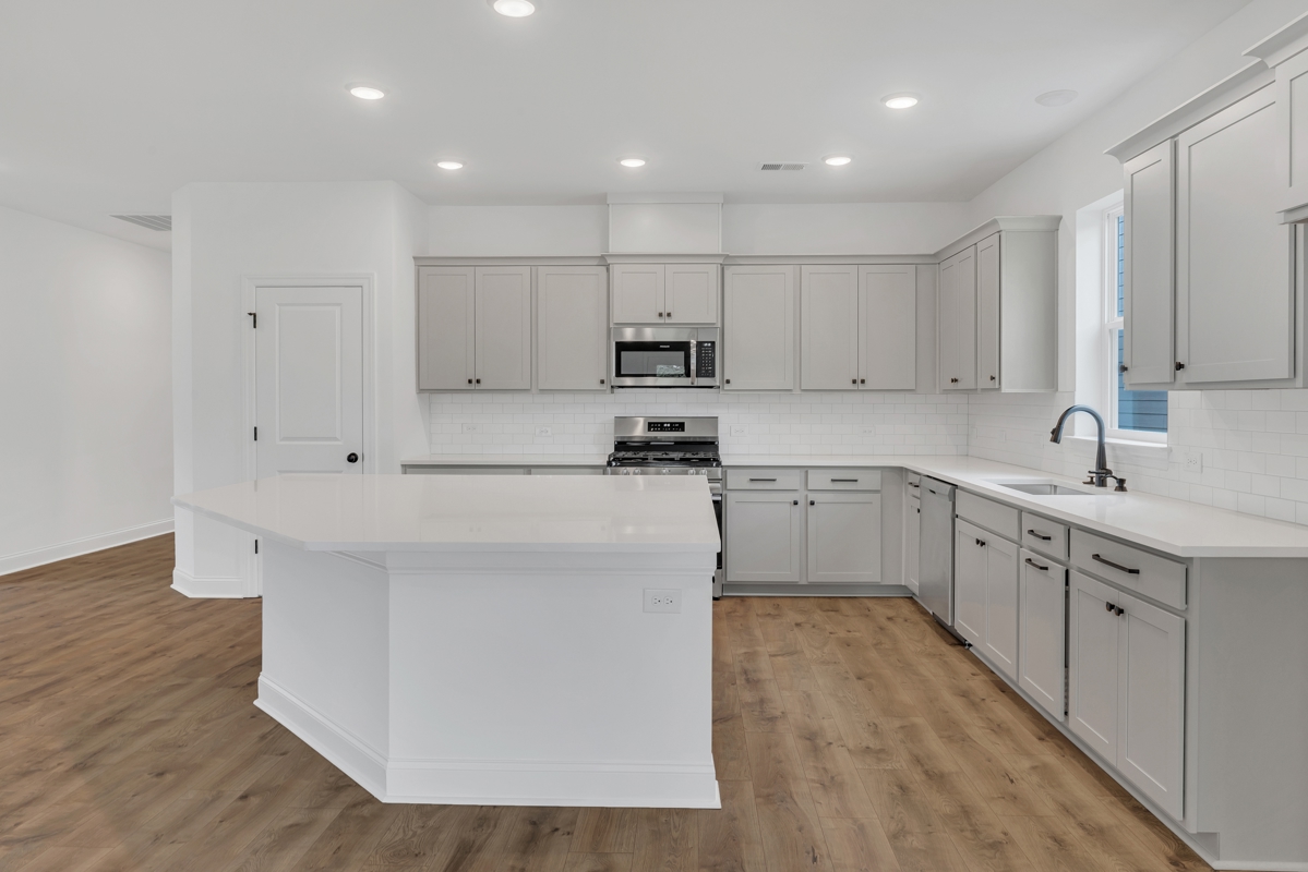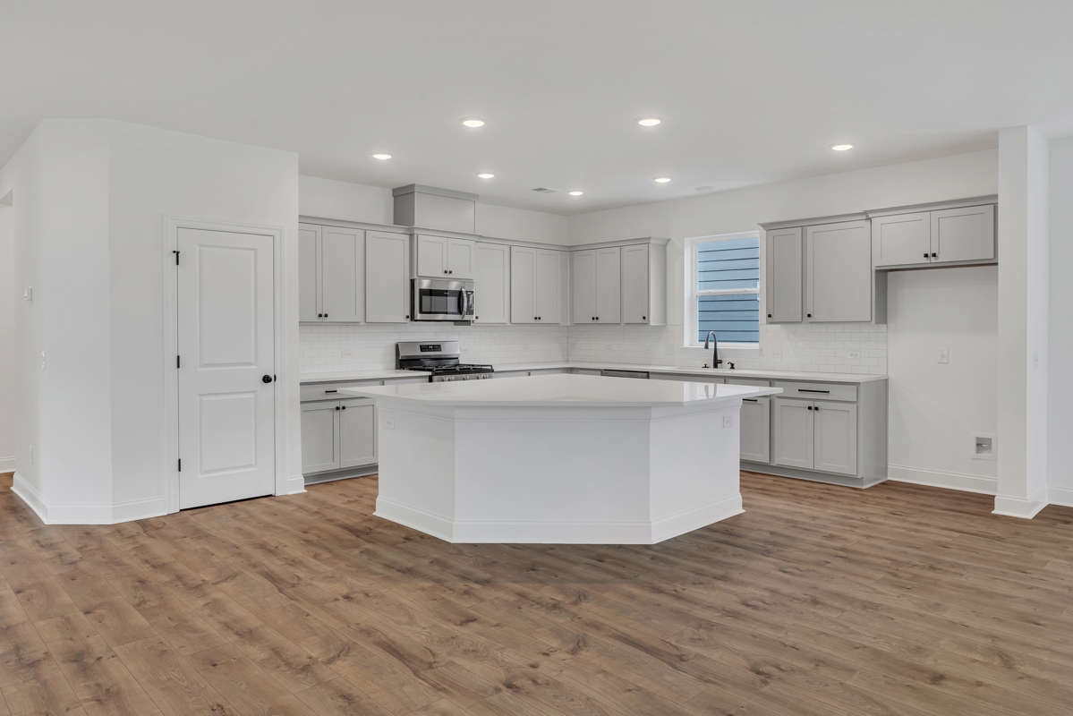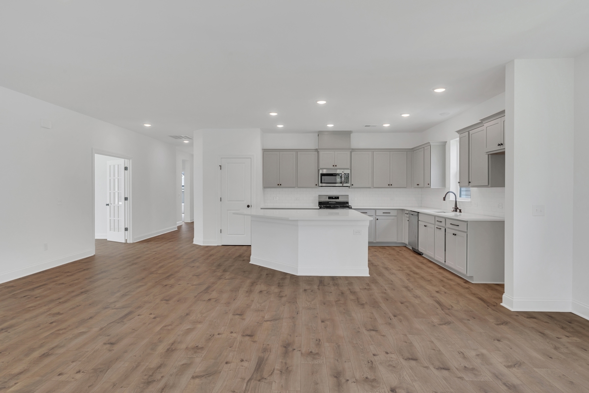 This open-concept floor plan features an entertainer’s kitchen with an oversized island, quartz countertops, a coordinating backsplash, and 36-inch upper cabinets—including a pull-out trash cabinet for added convenience.
