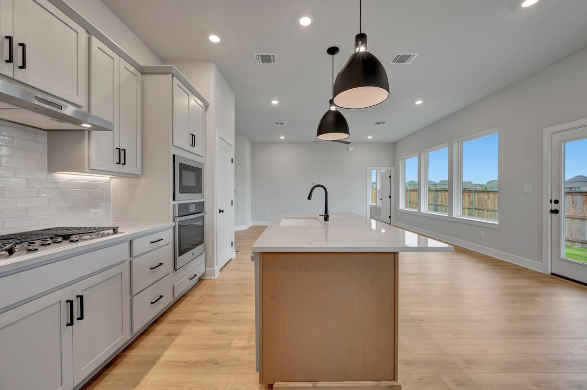 The kitchen is both beautiful and functional, featuring a 36-inch cooktop, built-in microwave and oven, and convenient storage solutions designed to support busy routines and effortless entertaining. Step outside to the extended covered rear porch, where peaceful mornings and relaxing evenings await—made even more enjoyable with no neighbors behind for added privacy.