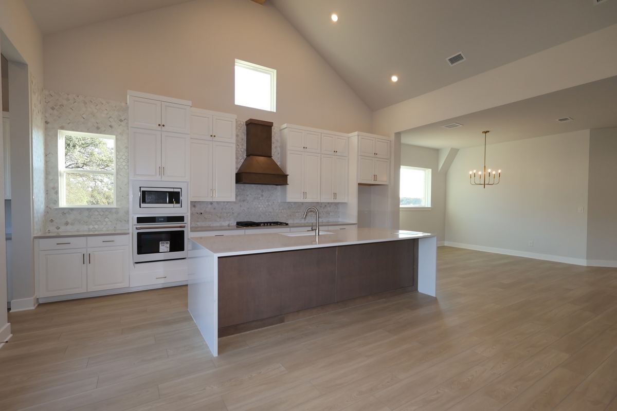 The expansive kitchen is designed to impress, featuring sleek finishes, abundant counter space, and a large island that flows effortlessly into the dining and family rooms, creating a warm and welcoming space for entertaining or casual gatherings.
