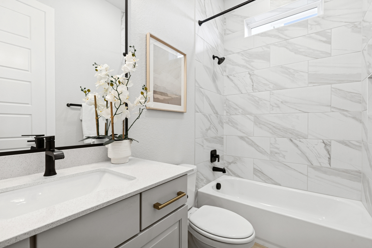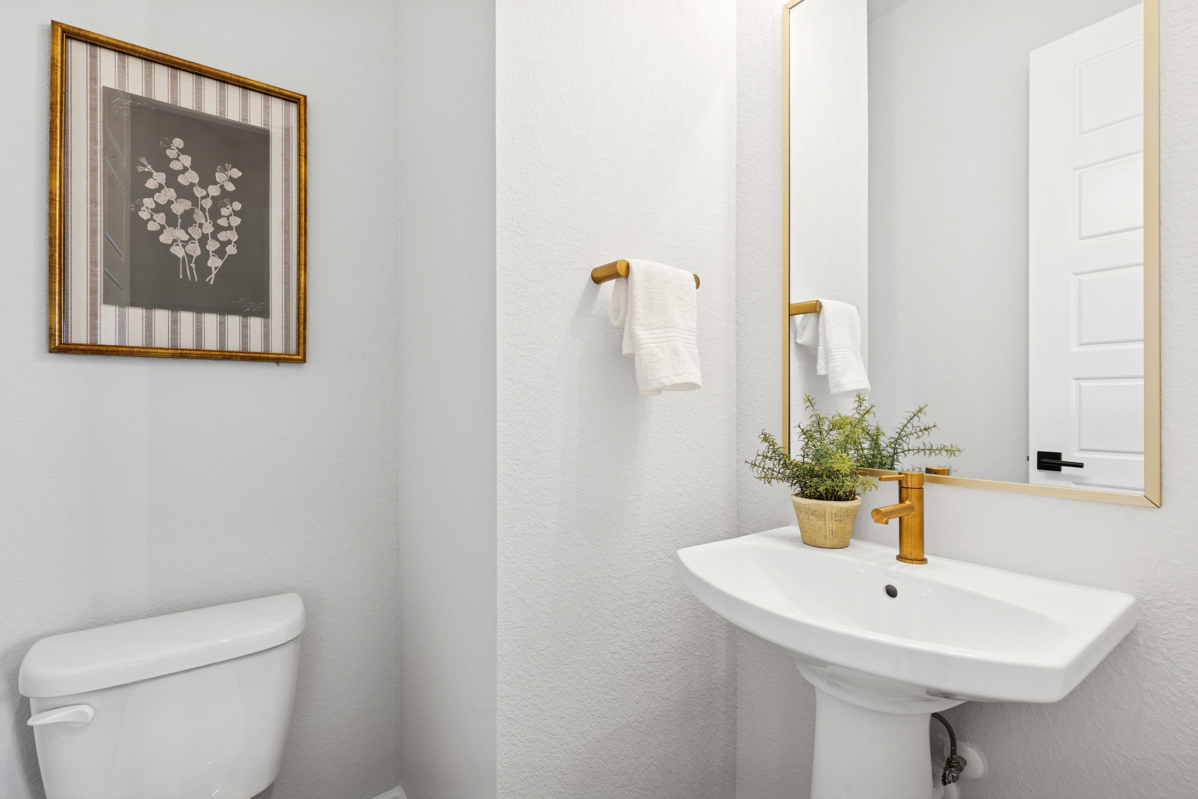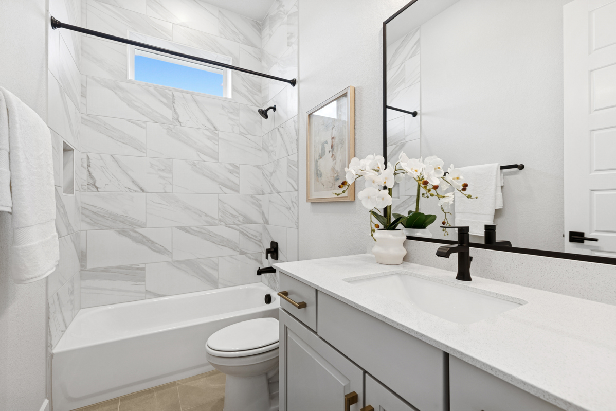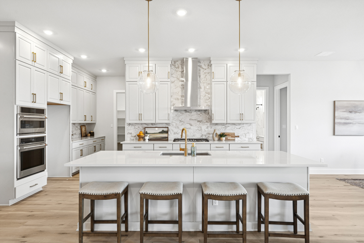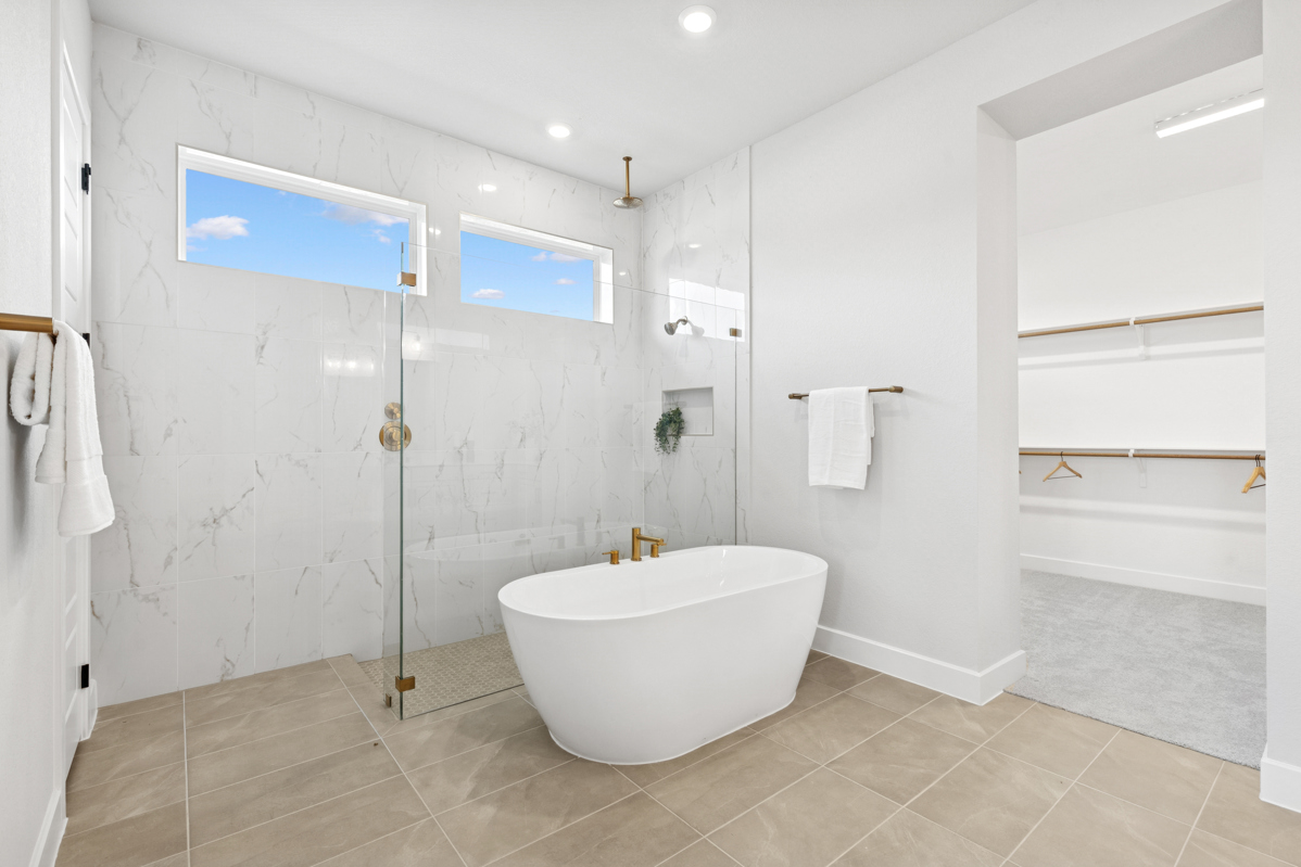 The huge Owner’s Bath is a true sanctuary, complete with a freestanding tub, pearl-hued tile, and champagne bronze fixtures. The Owner’s Retreat also boasts a luxurious closet with an island, providing ample storage and organization.