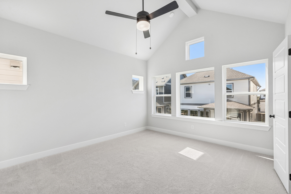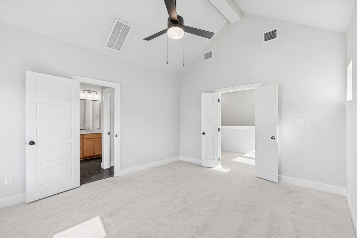 Upstairs, a private Owner's Retreat includes a spa-inspired Owner's Bath with warm wood cabinetry, white quartz counters, and designer tile accents. The secondary bedrooms share a full bath with coordinating finishes that create a cohesive, elevated look.