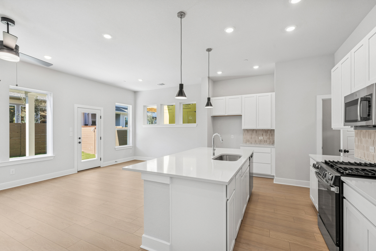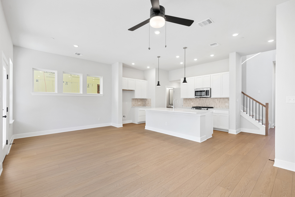 This beautifully designed two-story home in Double Creek Crossing offers 3 bedrooms, 2.5 bathrooms, a spacious loft, and a bright, open-concept main floor ideal for entertaining. The thoughtfully crafted kitchen features crisp white shaker cabinets, soft white quartz countertops, stylish pendant lighting, and a unique picket backsplash.