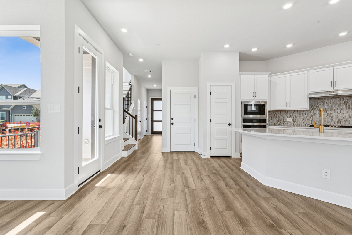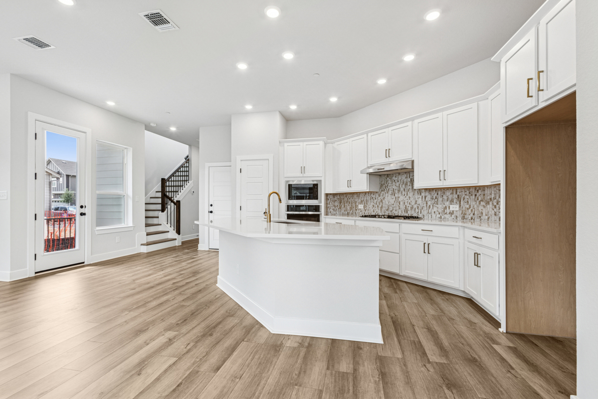 The open-concept chef’s kitchen flows seamlessly into spacious living and dining areas, creating an ideal setting for everything from casual gatherings to quiet nights in.