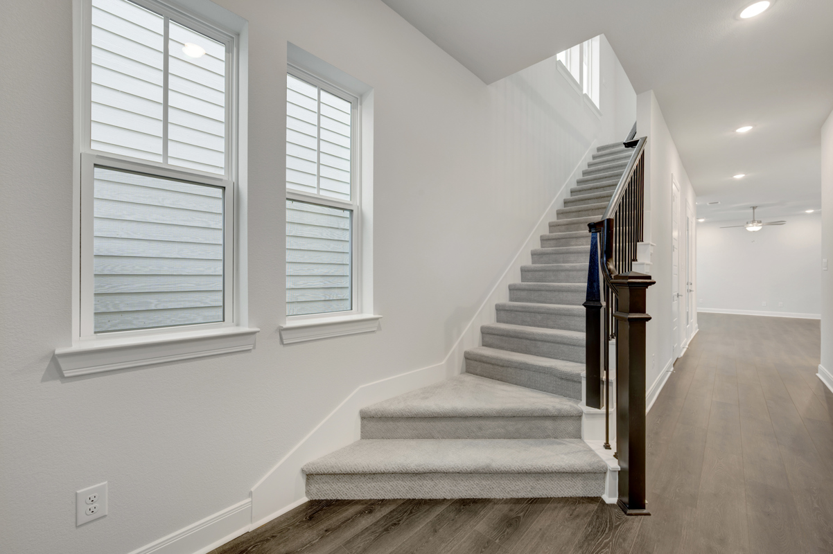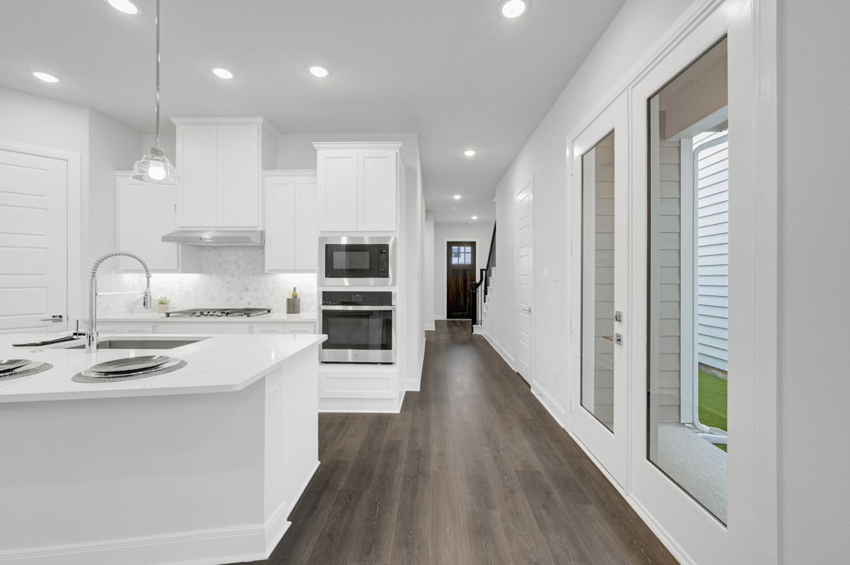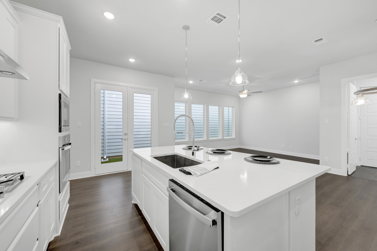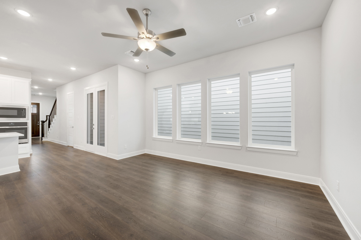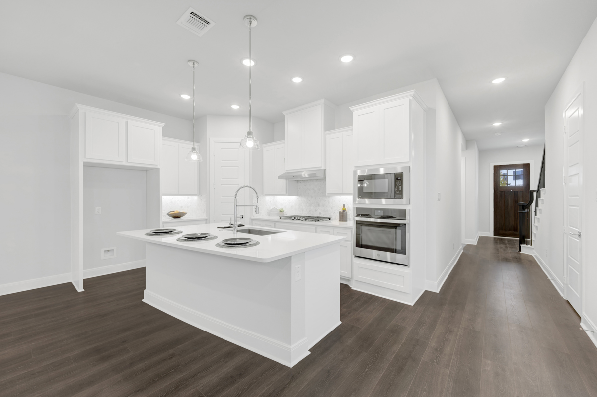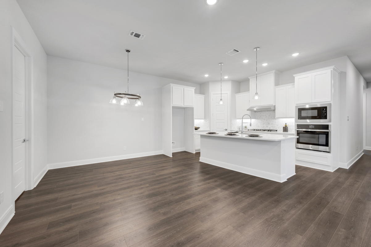 Featuring a large quartz island, the kitchen overlooks the open-concept family and dining areas, while brilliantly placed windows bring lightness and brightness to this two-story home.